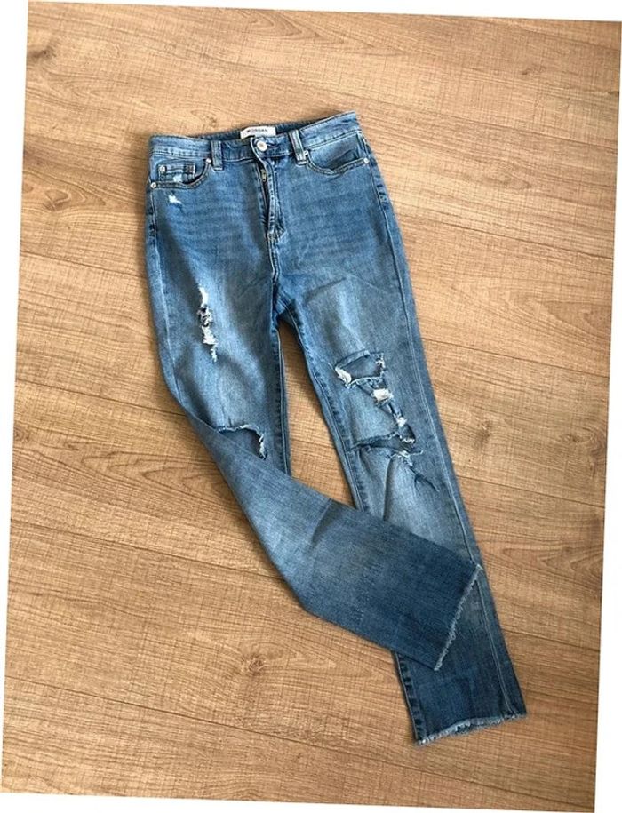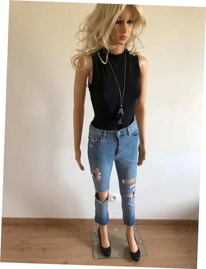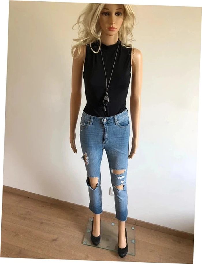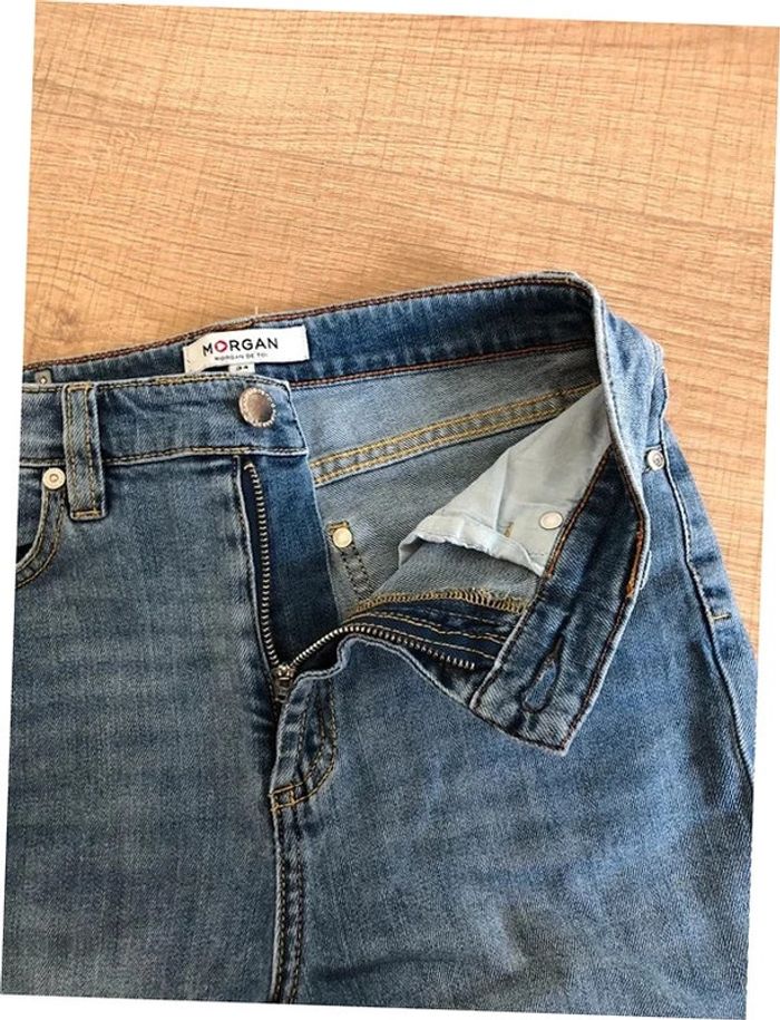 Jean bleu avec trous de marque Morgan. Taille 34. Peu porté, en très bon état. taille 34 cms longueur 91 cms longueur entrejambes 66 cms Étiquette intérieure de composition coupée Le prix reste négociable dans la limite du raisonnable.