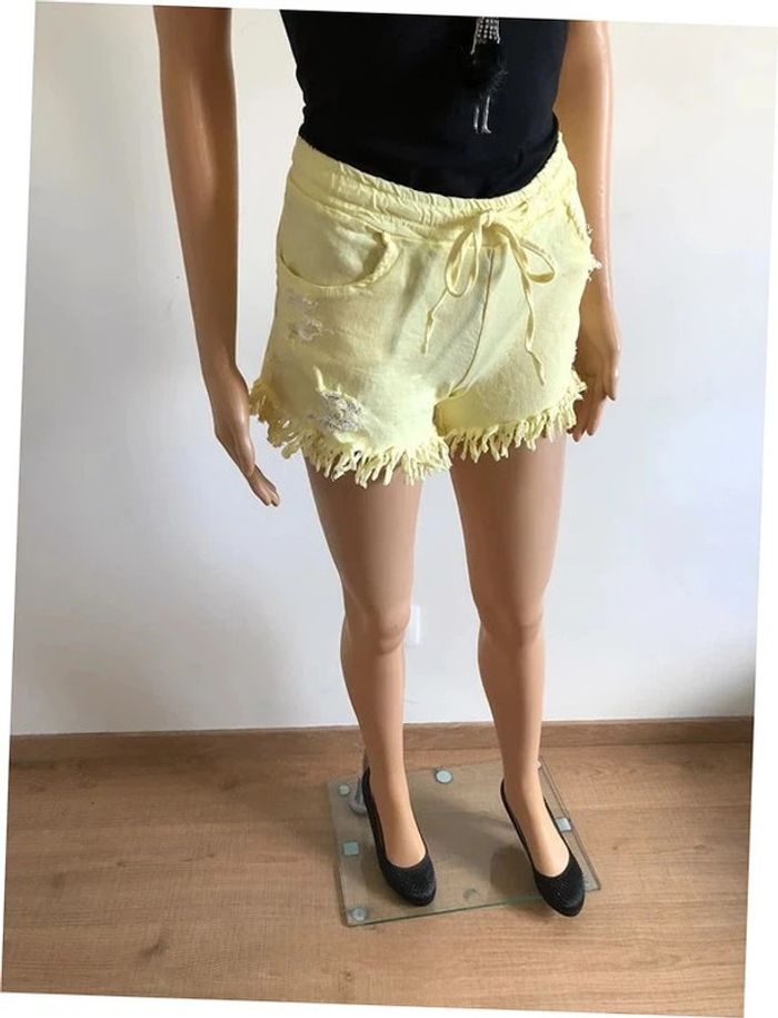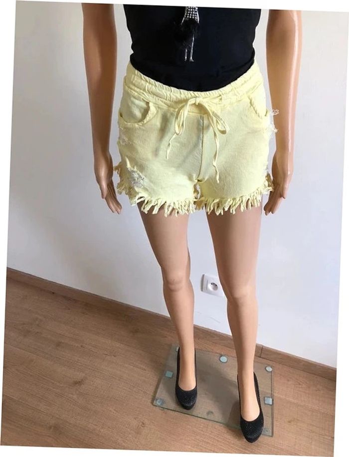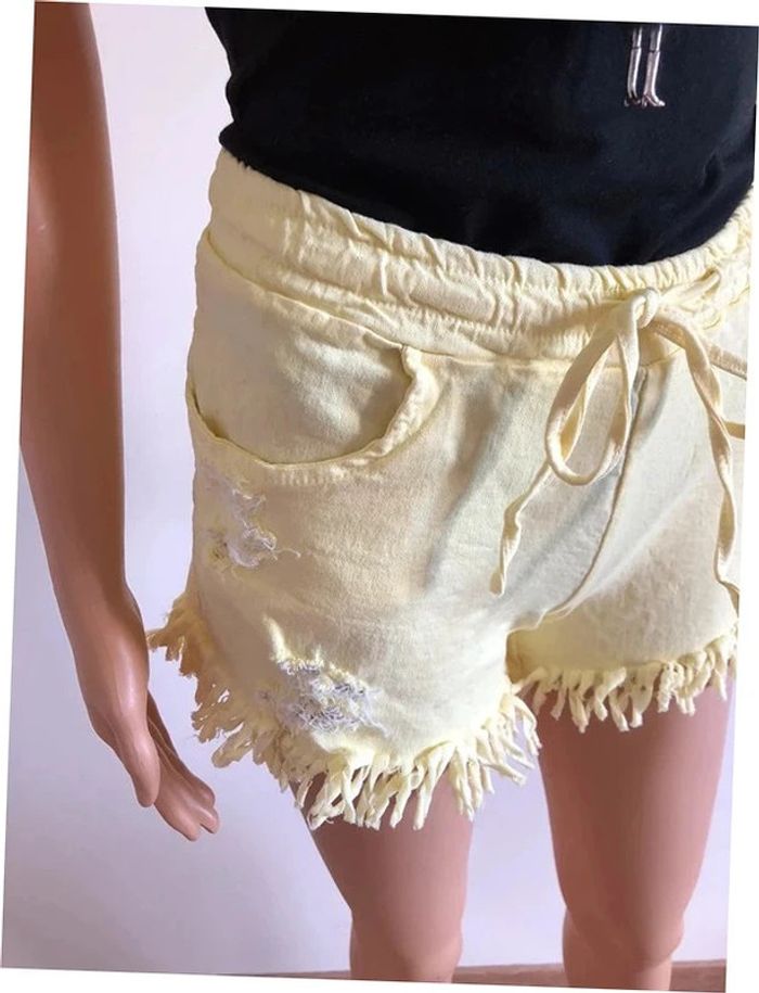 Joli short jaune à franges pour femme. Taille unique qui convient jusqu’au 38. Jamais porté état neuf. taille jusqu’à 44 cms longueur 29 cms Le tissu est extensible 70% coton et 30% polyester Le prix reste négociable dans la limite du raisonnable. Un petit cadeau dans le colis.