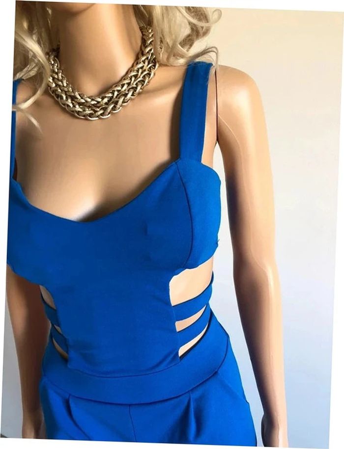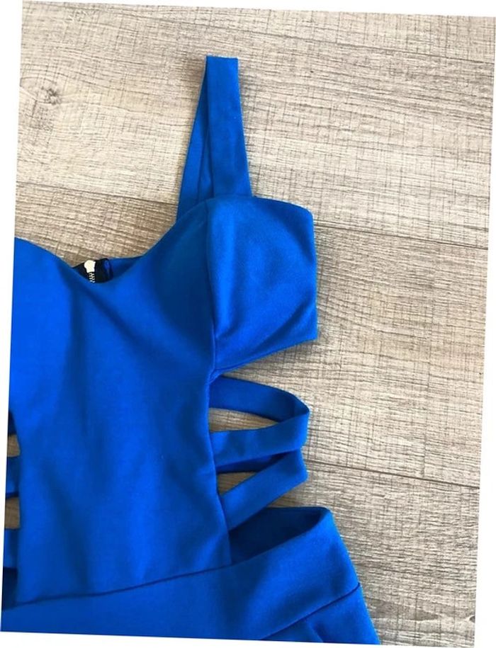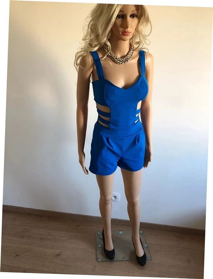 Joli combishort bleu ouvert au niveau du ventre, avec fermeture dans le dos. Taille unique mais correspond à un 34/36. Jamais porté car trop petit pour moi, état neuf. aisselle à aisselle 40 cms taille 34 cms longueur depuis épaule 75 cms Le tissu est extensible 96% polyester et 4% elasthanne Le prix reste négociable dans la limite du raisonnable. Un petit cadeau dans le colis. (Boîte 50)