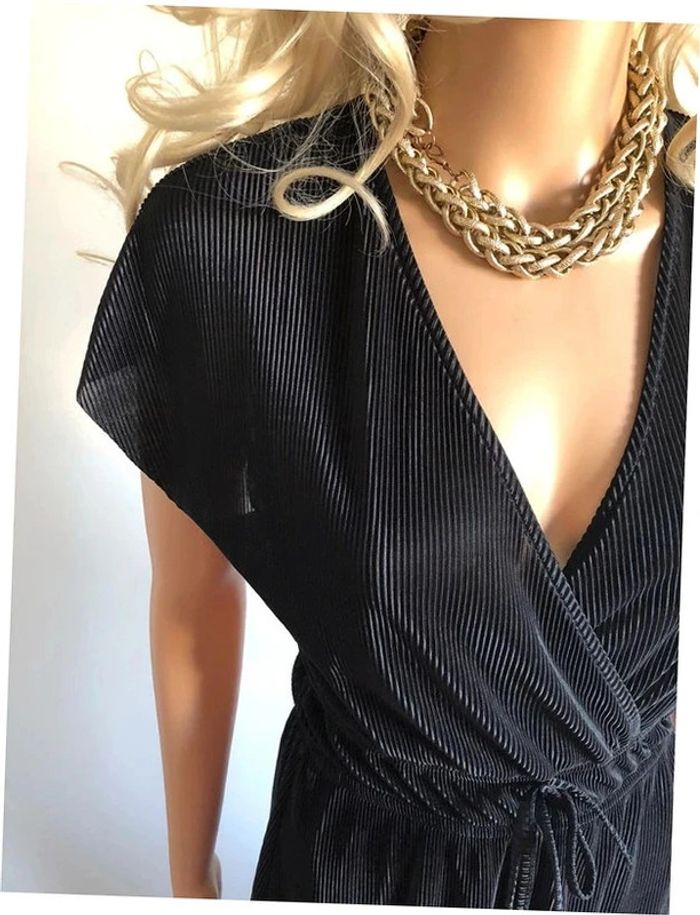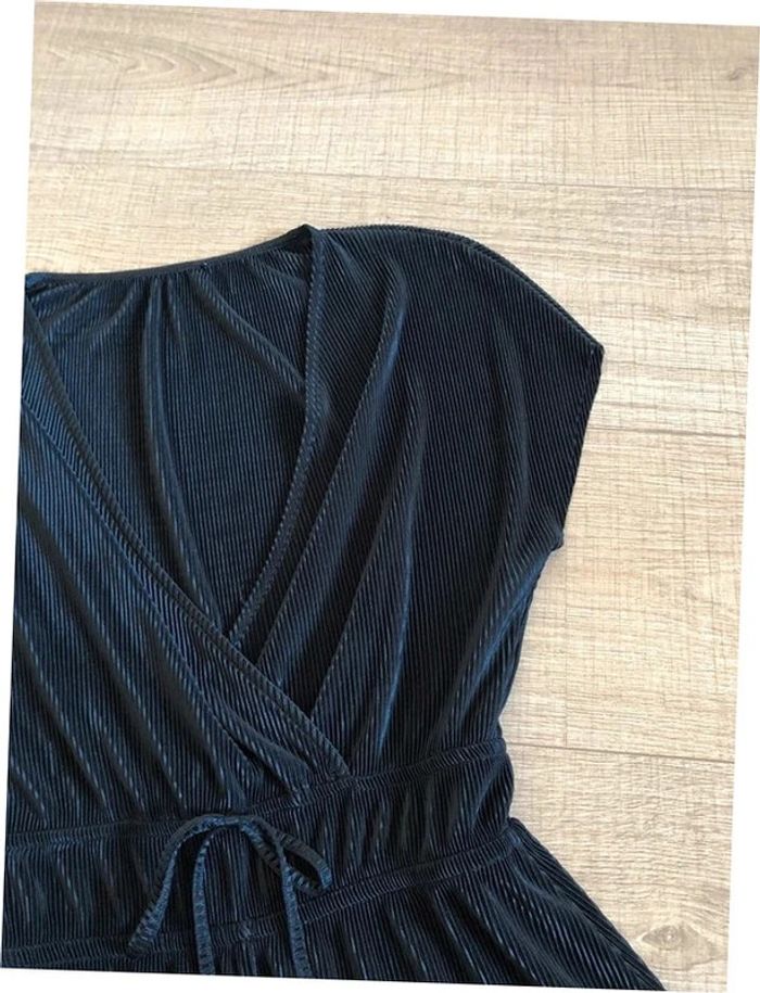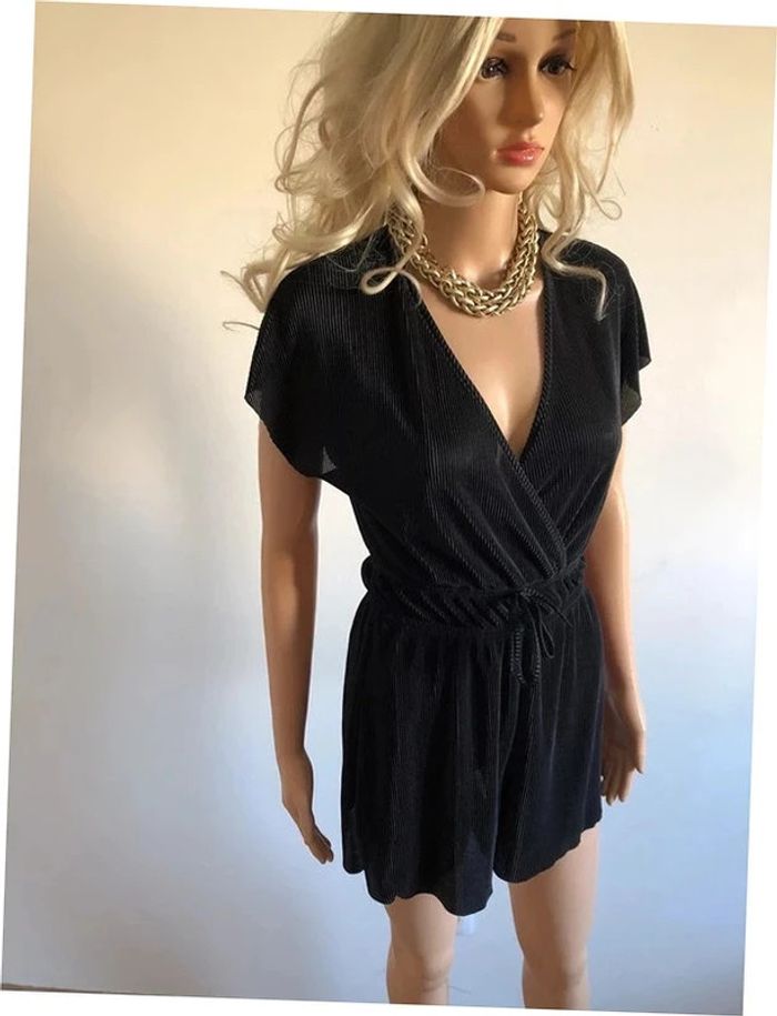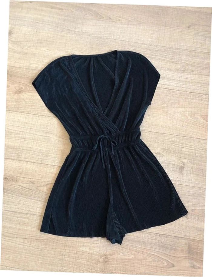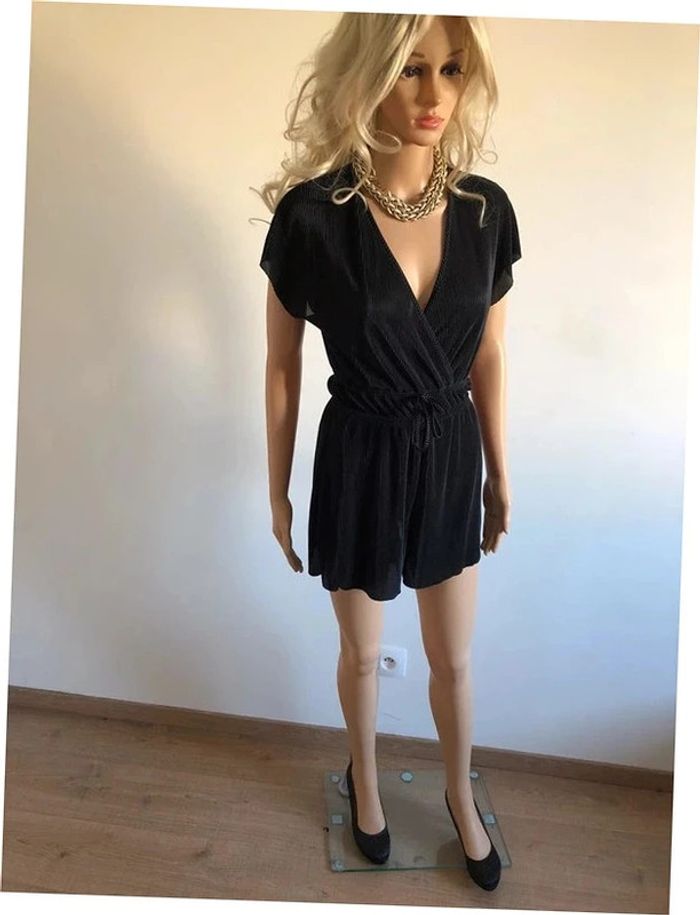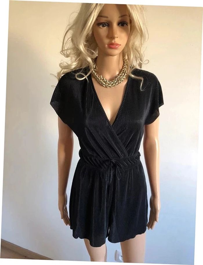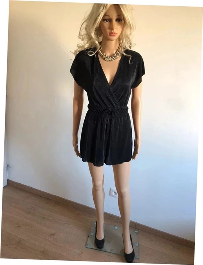 Très beau combishort noir à manches courtes. Correspond à une taille XS (étiquette taille manquante, voir mesures en dessous). Porté une fois, en excellent état. aisselle à aisselle 42 cms et plus taille 32 cms et plus longueur depuis épaule 74 cms Le tissu est extensible Étiquette intérieure de composition coupée Le prix reste négociable dans la limite du raisonnable. Un petit cadeau dans le colis.
