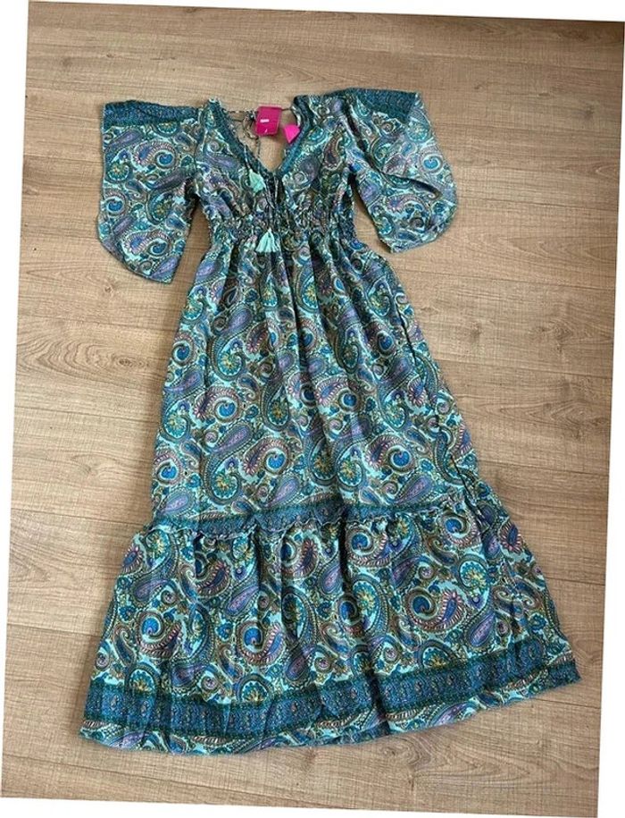 Magnifique robe longue imprimée à manches courtes. Taille unique. Elle est neuve avec étiquette. 70% soie et 30% polyester Le prix reste négociable dans la limite du raisonnable. Un petit cadeau dans le colis.
