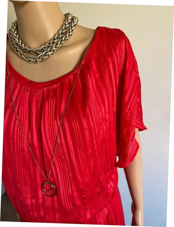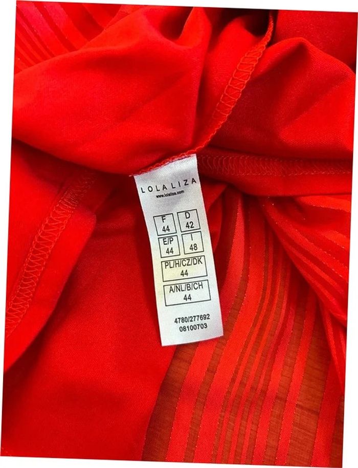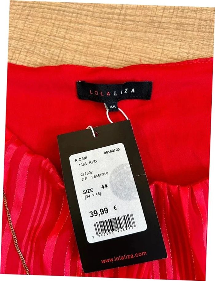 Magnifique robe rouge avec filaments dorés, à manches courtes, de marque LolaLiza. Bijou intègre et petit cordon à nouer à la taille. Taille 44. Elle est neuve avec étiquette (valeur 40€). aisselle à aisselle 51 cms taille 40 cms à 55 cms longueur depuis épaule 98 cms La taille est extensible 100% polyester Le prix reste négociable dans la limite du raisonnable. Un petit cadeau dans le colis 🌸