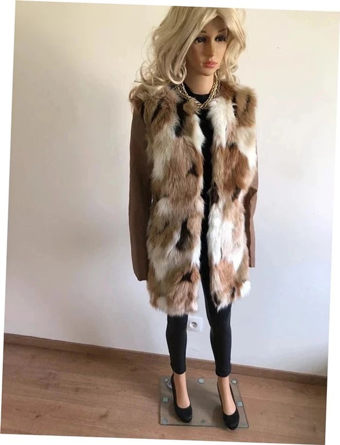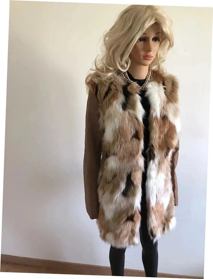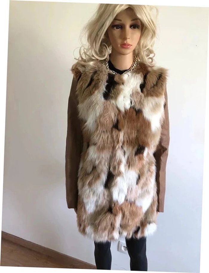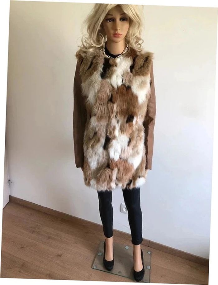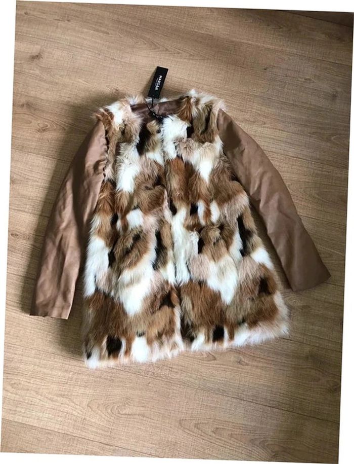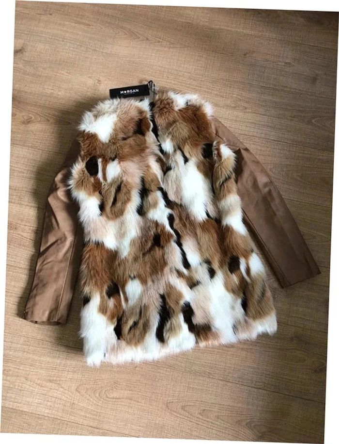 Magnifique manteau beige mi long en fausse fourrure, avec manches en simili cuir, de marque Morgan. Fermeture par crochets. Taille 40. Il est neuf avec étiquette (valeur en boutique 130€). aisselle à aisselle 47 cms épaule à épaule 39 cms longueur manches 62 cms taille 47 cms longueur depuis épaule 79 cms 37% acrylique, 35% polyester et 28% modacrylique Le prix reste négociable dans la limite du raisonnable. Un petit cadeau dans le colis.