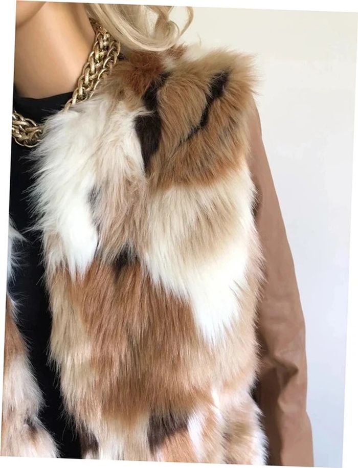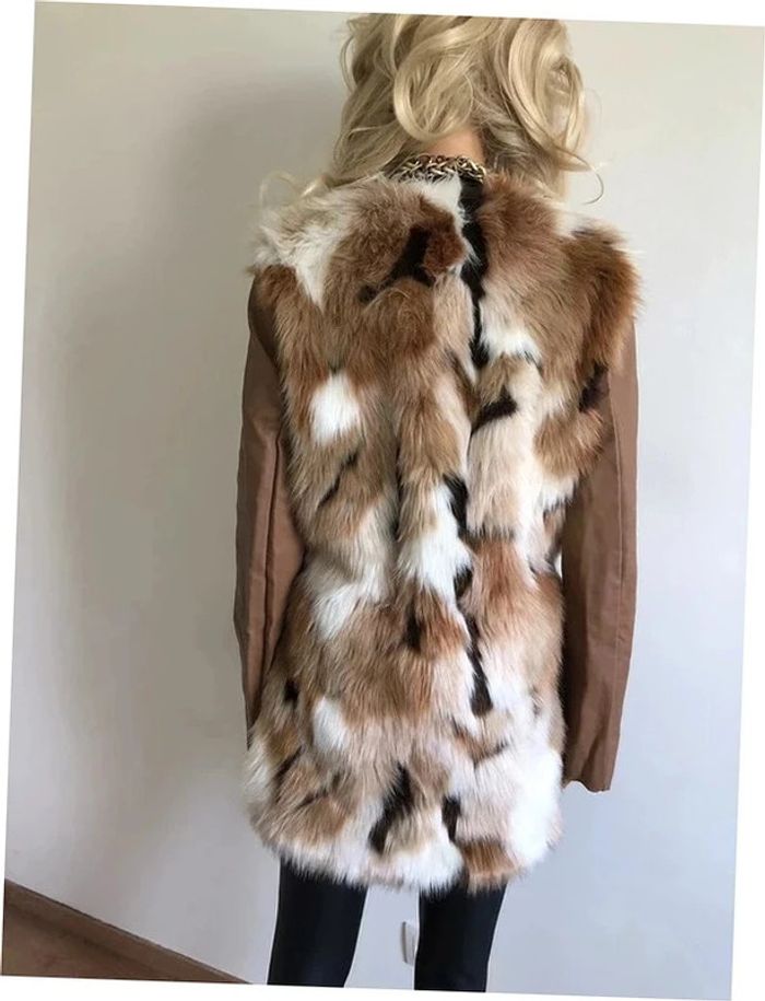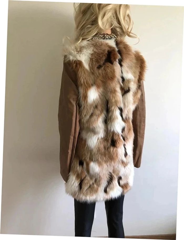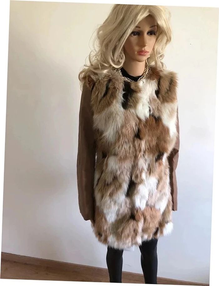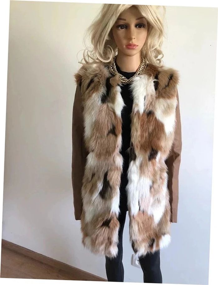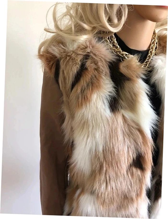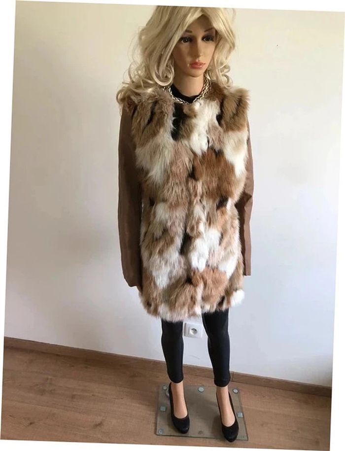 Magnifique manteau beige mi long en fausse fourrure, avec manches en simili cuir, de marque Morgan. Fermeture par crochets. Taille 40. Il est neuf avec étiquette (valeur en boutique 130€). aisselle à aisselle 47 cms épaule à épaule 39 cms longueur manches 62 cms taille 47 cms longueur depuis épaule 79 cms 37% acrylique, 35% polyester et 28% modacrylique Le prix reste négociable dans la limite du raisonnable. Un petit cadeau dans le colis.