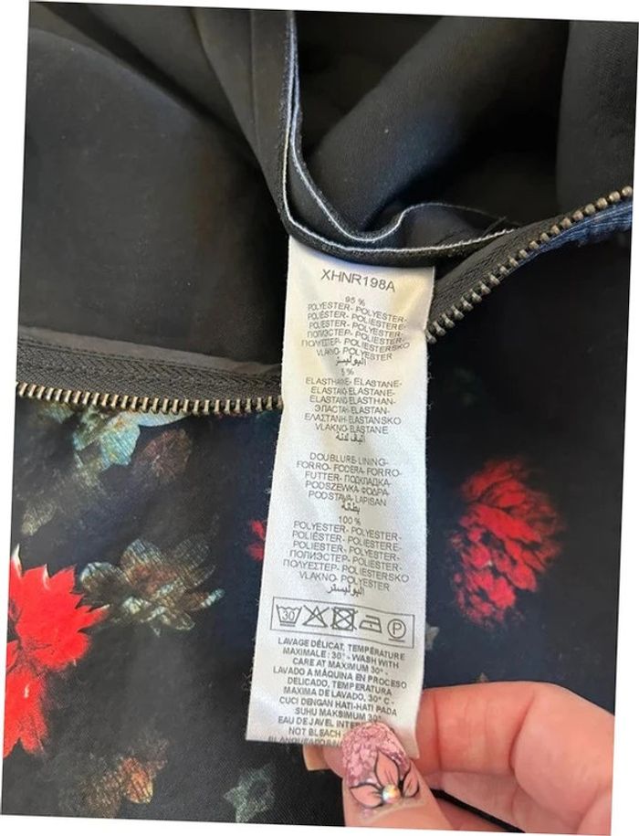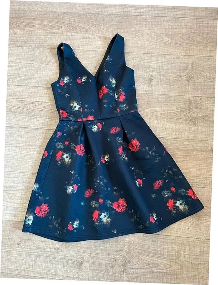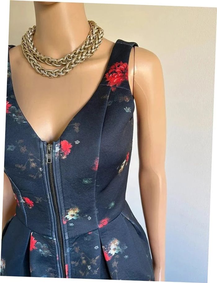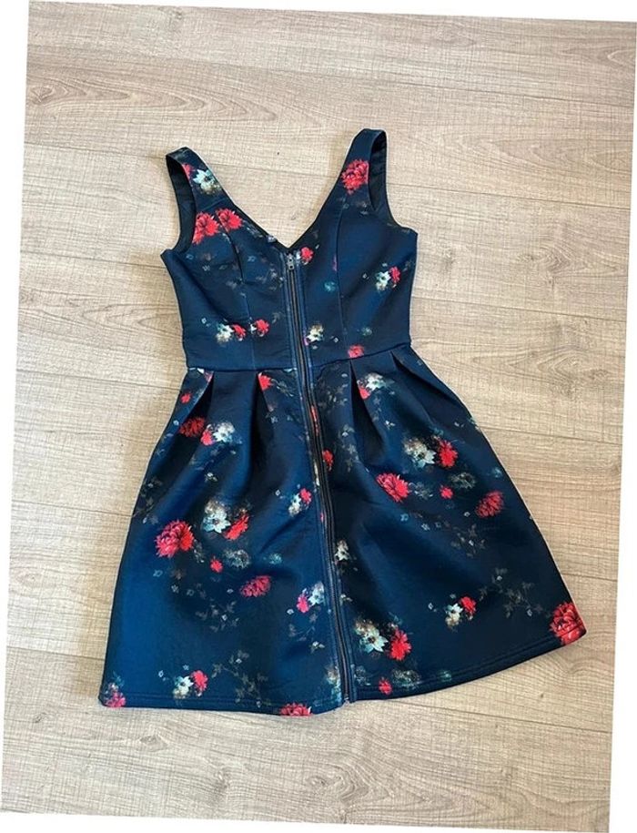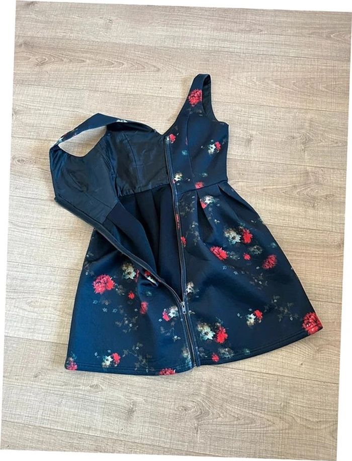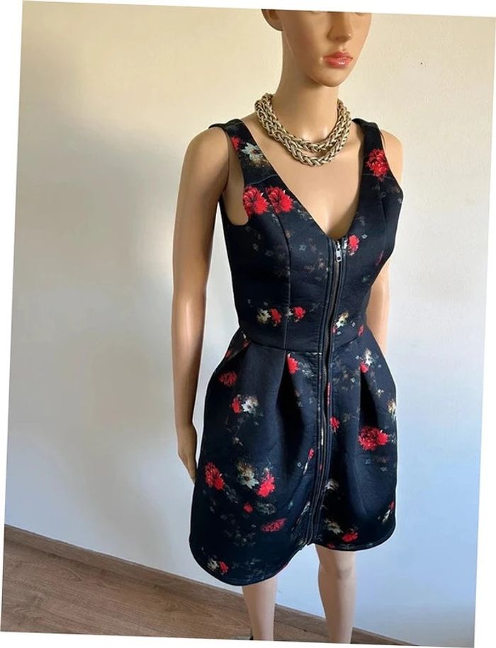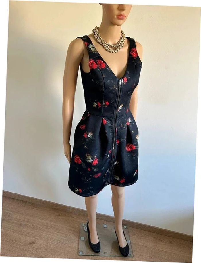 Jolie robe noire et imprimée fleurie, sans manches, de marque Naf Naf. Fermeture zippée sur le devant. Correspond à une taille 36 (étiquette de taille coupée, voir mesures en dessous). Peu portée, en très bon état. aisselle à aisselle 41 cms taille 36 cms longueur depuis épaule 86 cms 95% polyester et 5% elasthanne Le prix reste négociable dans la limite du raisonnable. Un petit cadeau dans le colis 🌸 (Boîte 34)