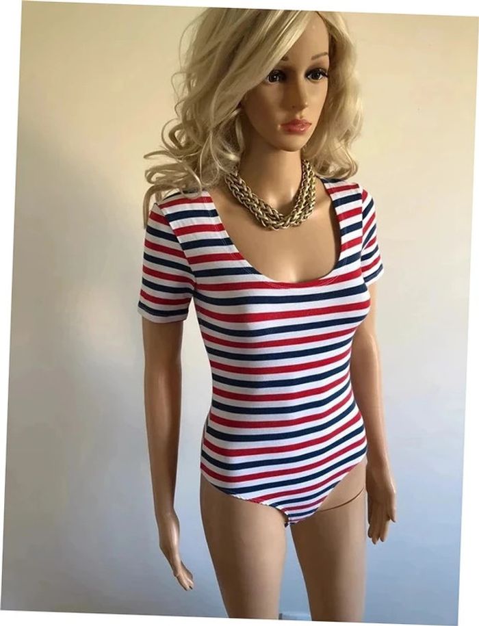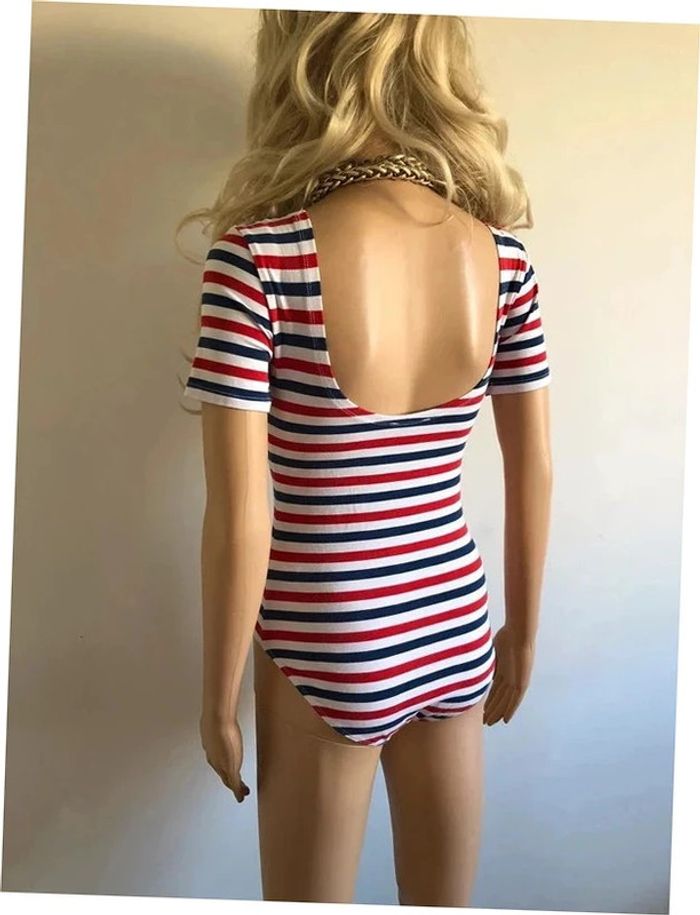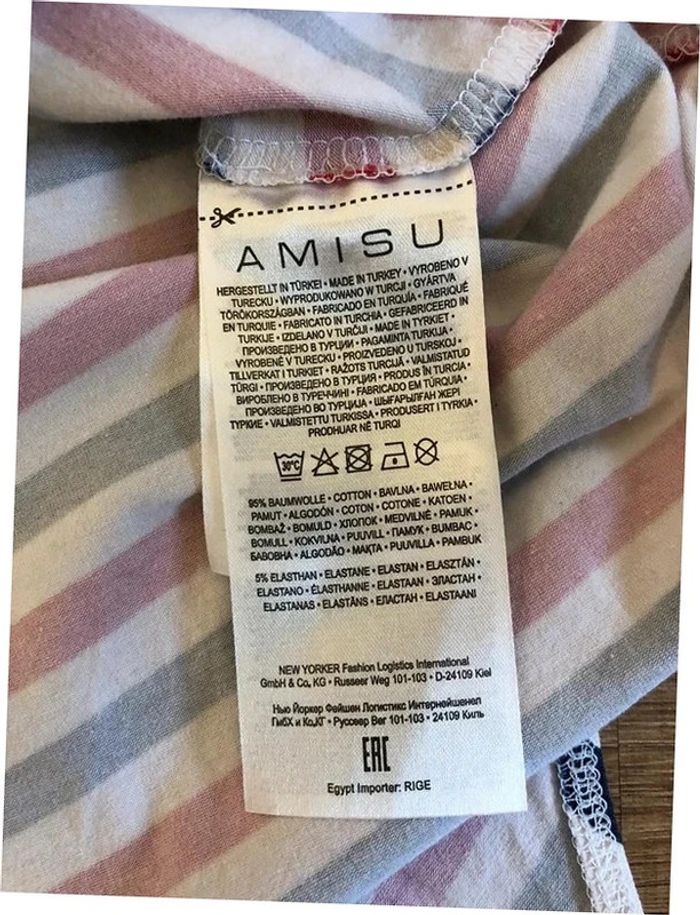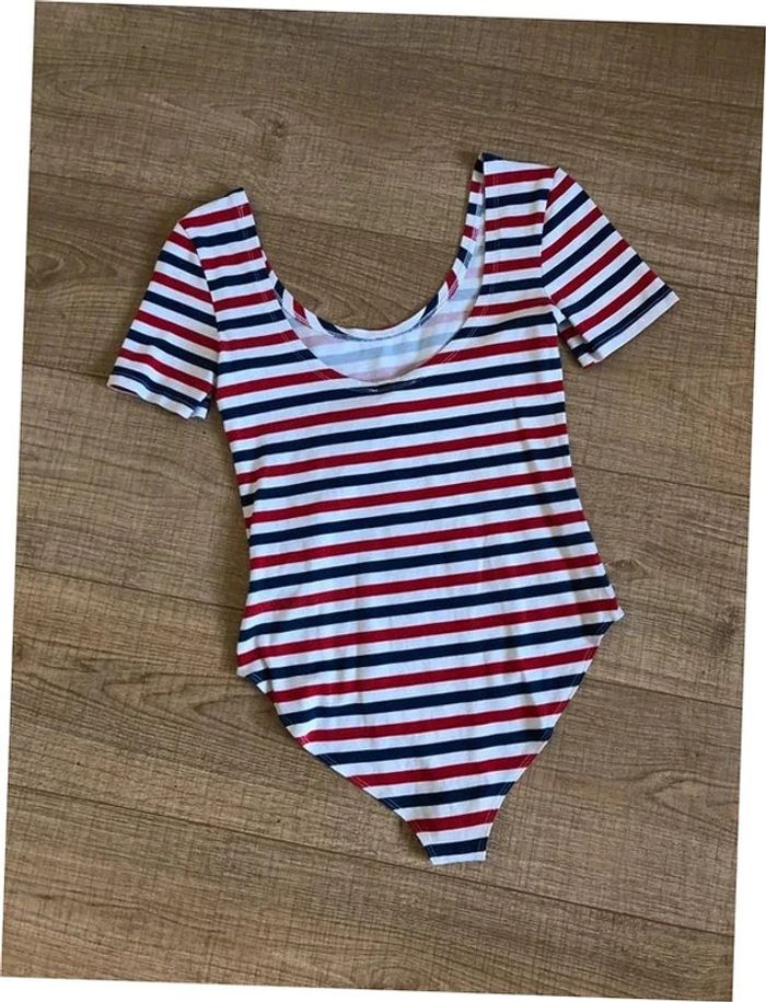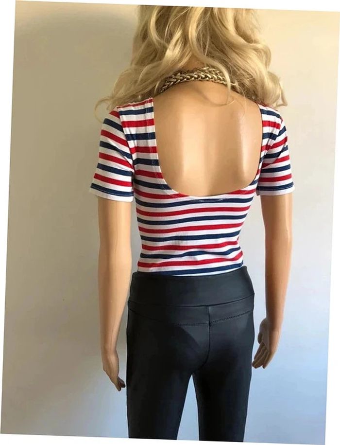 Body rayé blanc bleu et rouge, à manches courtes, de marque Amisu. Taille XS. Porté quelques fois mais encore en bon état. aisselle à aisselle 35 cms à 47 cms taille 32 cms et plus longueur depuis épaule 66 cms Le tissu est extensible 95% coton et 5% elasthanne Le prix reste négociable dans la limite du raisonnable.
