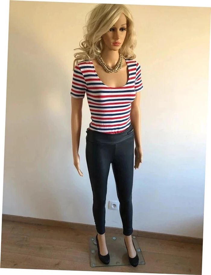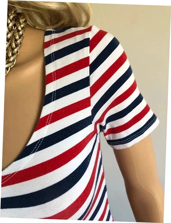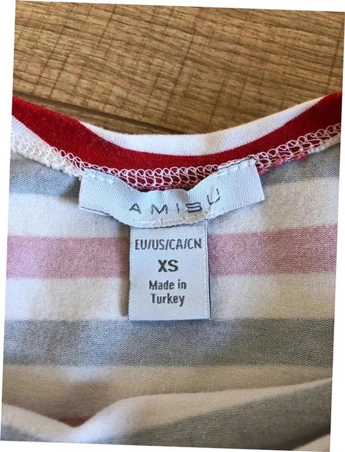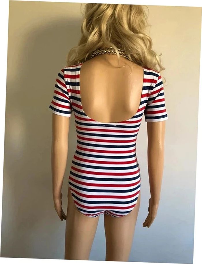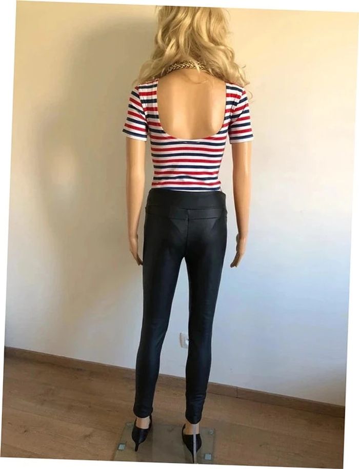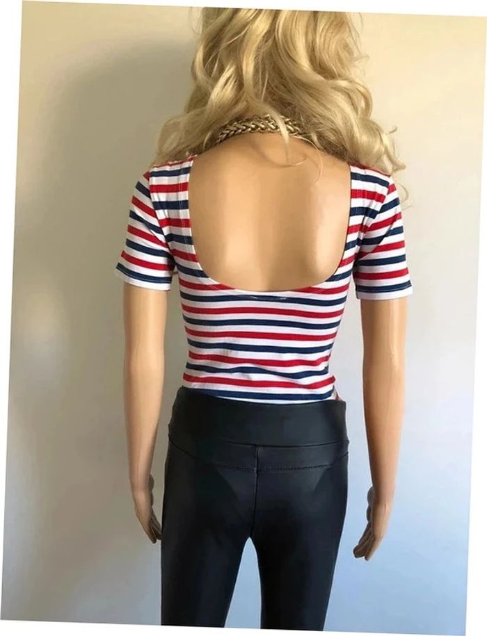 Body rayé blanc bleu et rouge, à manches courtes, de marque Amisu. Taille XS. Porté quelques fois mais encore en bon état. aisselle à aisselle 35 cms à 47 cms taille 32 cms et plus longueur depuis épaule 66 cms Le tissu est extensible 95% coton et 5% elasthanne Le prix reste négociable dans la limite du raisonnable.