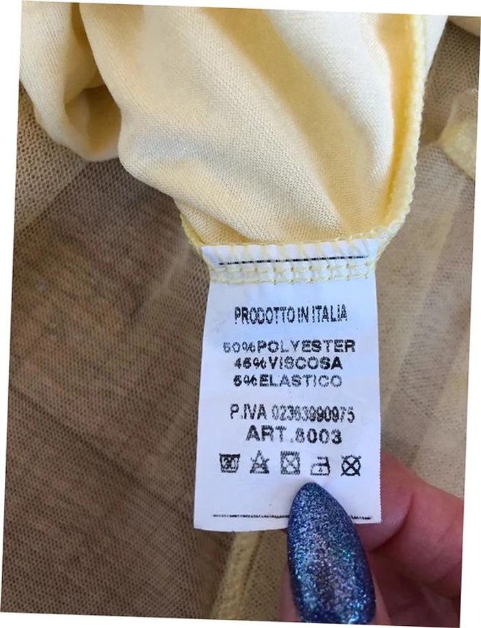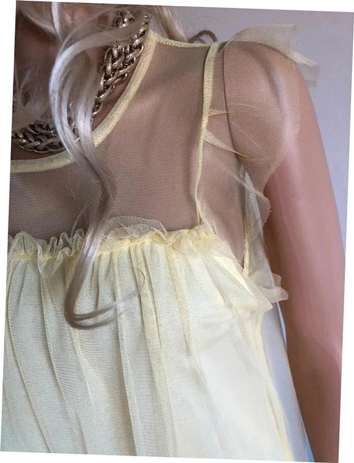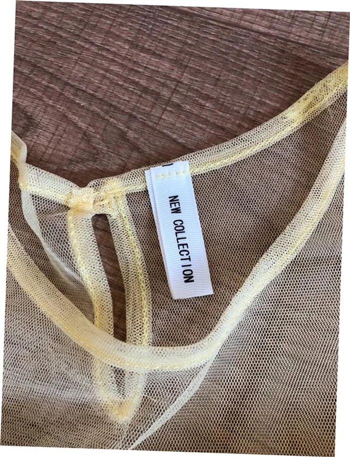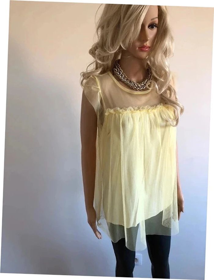Jolie blouse jaune claire avec tulle, sans manches, de marque New Collection. Taille unique qui convient jusqu’au 38. Jamais portée car pas mon style, état neuf. 50% polyester, 45% viscose et 5% elasthanne Le prix reste négociable dans la limite du raisonnable. Un petit cadeau dans le colis 🌸
