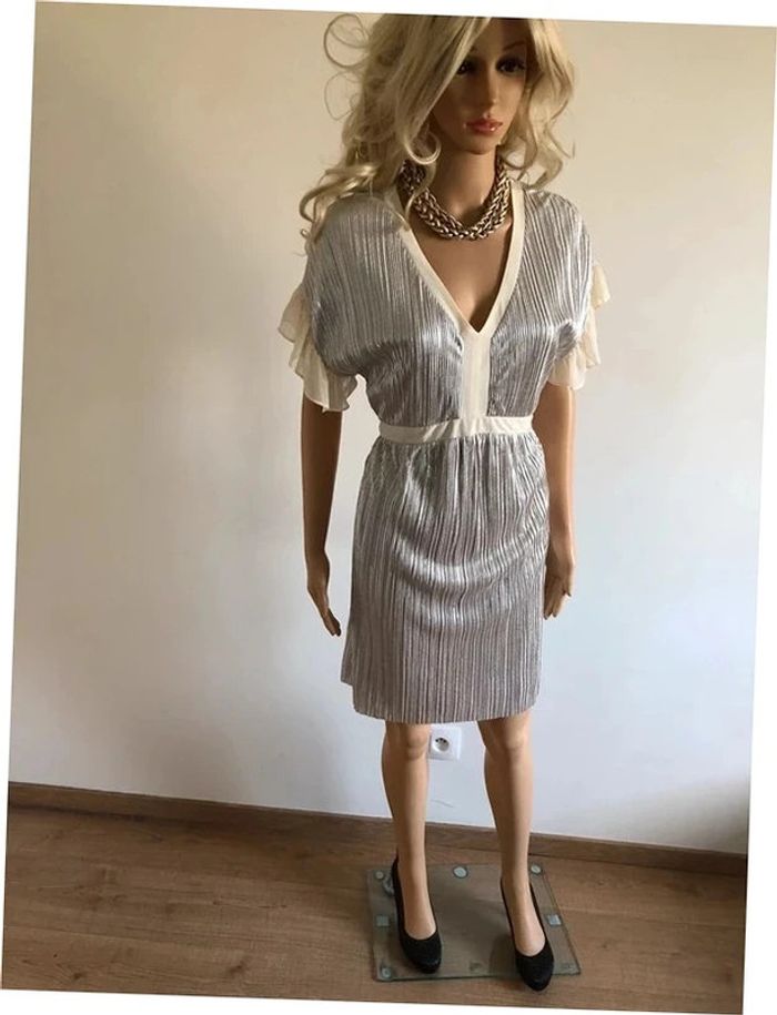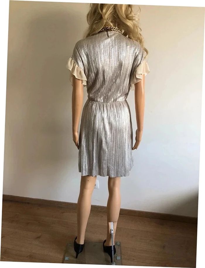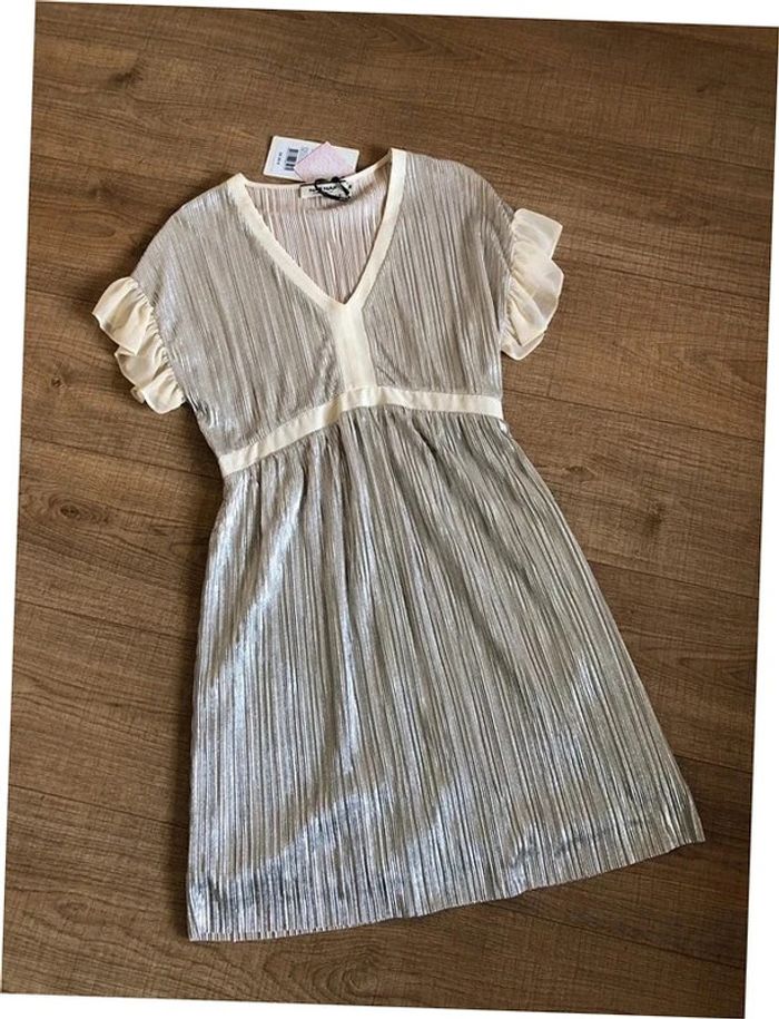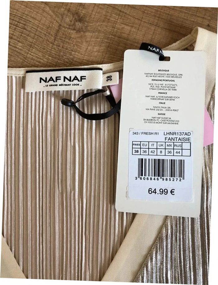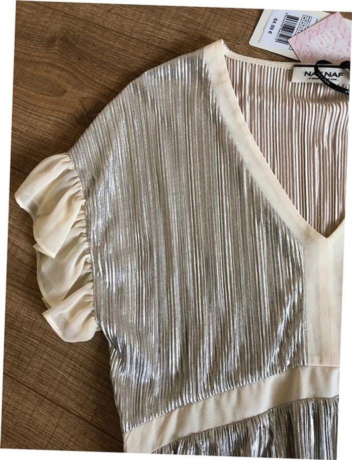 Magnifique robe mordorée irisée, avec volants au niveau des bras, à manches courtes, de marque Naf Naf. Taille 38. Elle est neuve avec étiquette (valeur 65€). aisselle à aisselle 46 cms taille 38 cms longueur depuis épaule 92 cms 100% polyester Le prix reste négociable dans la limite du raisonnable. Un petit cadeau dans le colis. (Boîte 28)