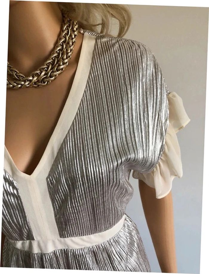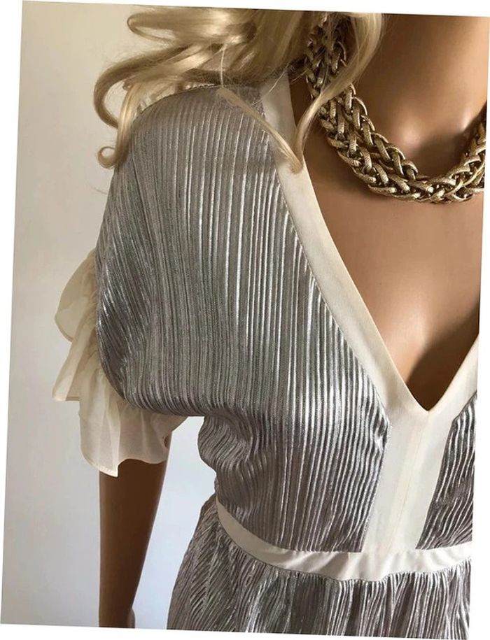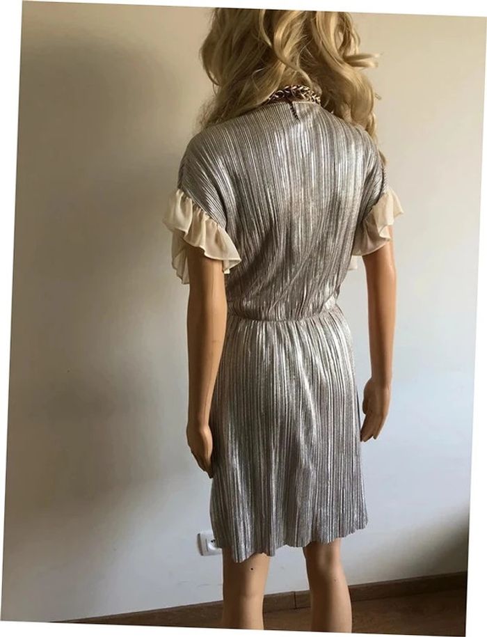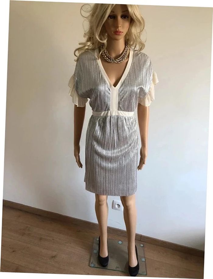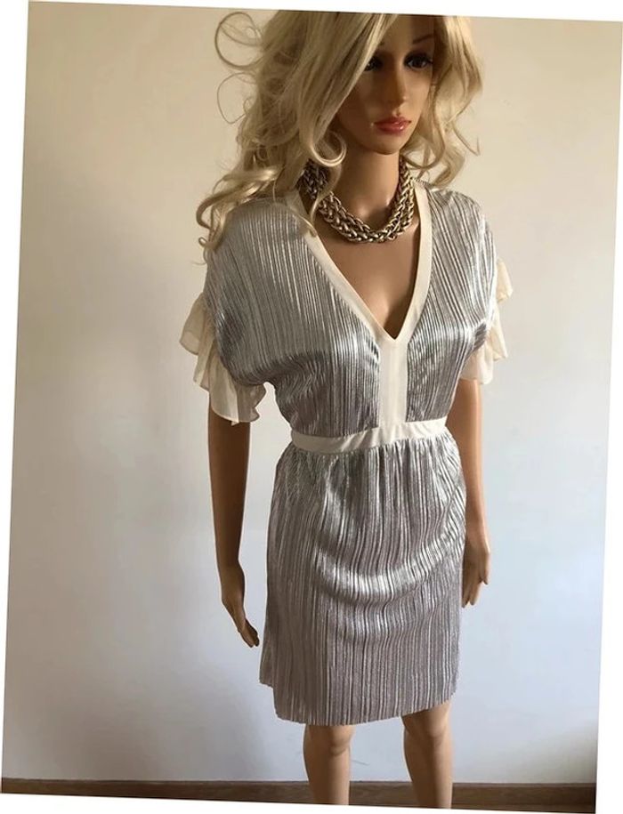 Magnifique robe mordorée irisée, avec volants au niveau des bras, à manches courtes, de marque Naf Naf. Taille 38. Elle est neuve avec étiquette (valeur 65€). aisselle à aisselle 46 cms taille 38 cms longueur depuis épaule 92 cms 100% polyester Le prix reste négociable dans la limite du raisonnable. Un petit cadeau dans le colis. (Boîte 28)