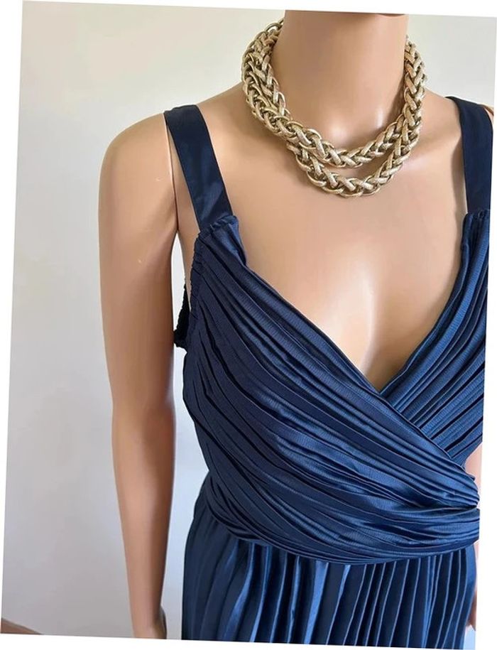 Magnifique robe longue plissée bleue marine, de marque Boohoo. Taille 40. Elle est neuve avec étiquette. aisselle à aisselle 46 cms taille 40 cms longueur depuis épaule environ 158 cms 100% polyester Le prix reste négociable dans la limite du raisonnable. Un petit cadeau dans le colis 🌸