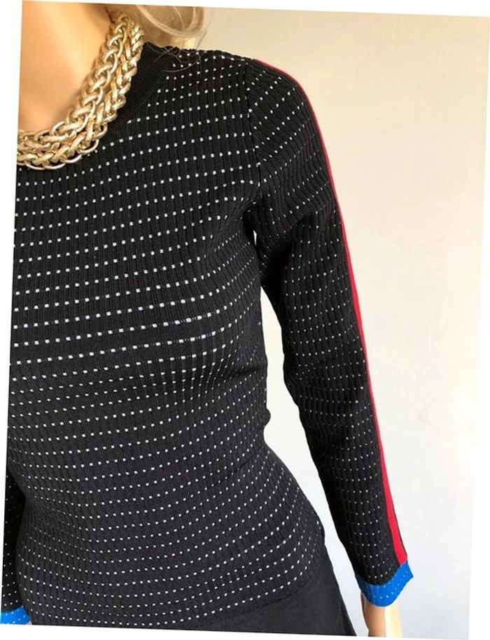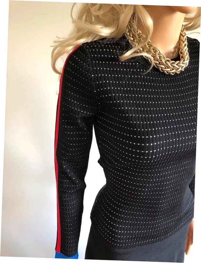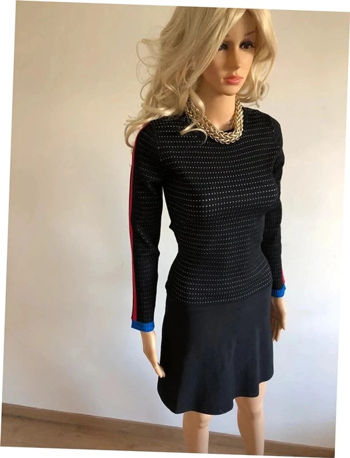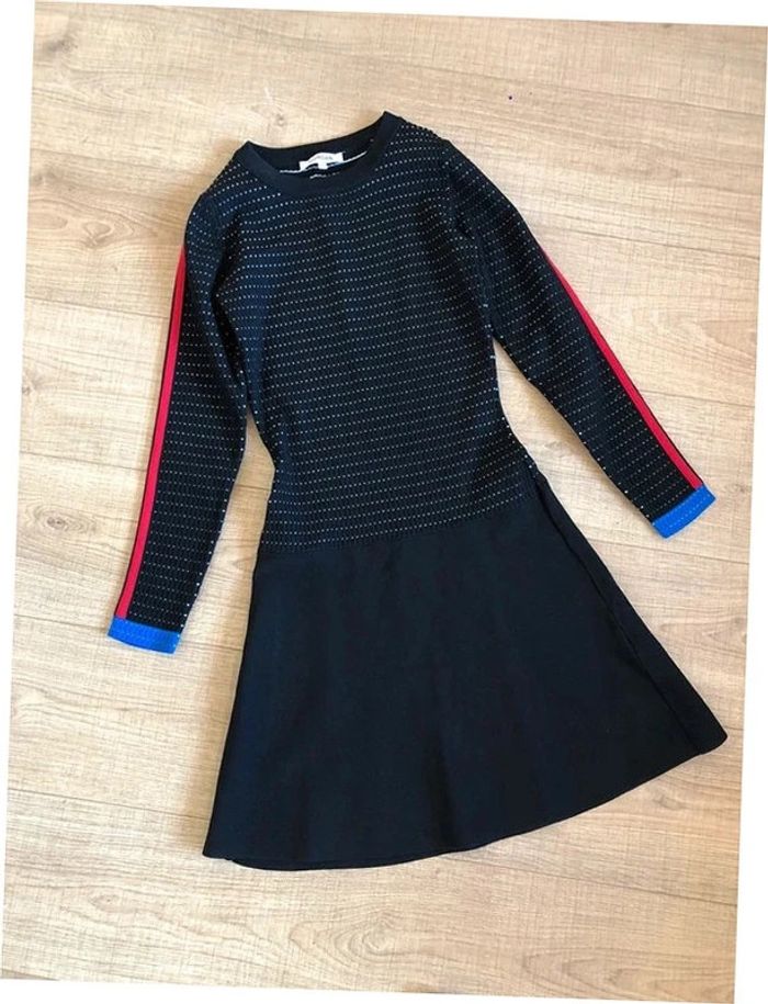 Magnifique robe pull noire à manches longues, avec bandes bleues et rouges sur les manches, de marque Morgan. Taille S. Jamais portée, état neuf. aisselle à aisselle 36 cms à 45 cms épaule à épaule 33 cms à 39 cms longueur manches 56 cms taille 31 cms à 39 cms longueur depuis épaule 90 cms Le tissu est extensible 51% viscose et 49% polyamide Le prix reste négociable dans la limite du raisonnable. Un petit cadeau dans le colis.