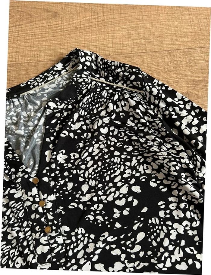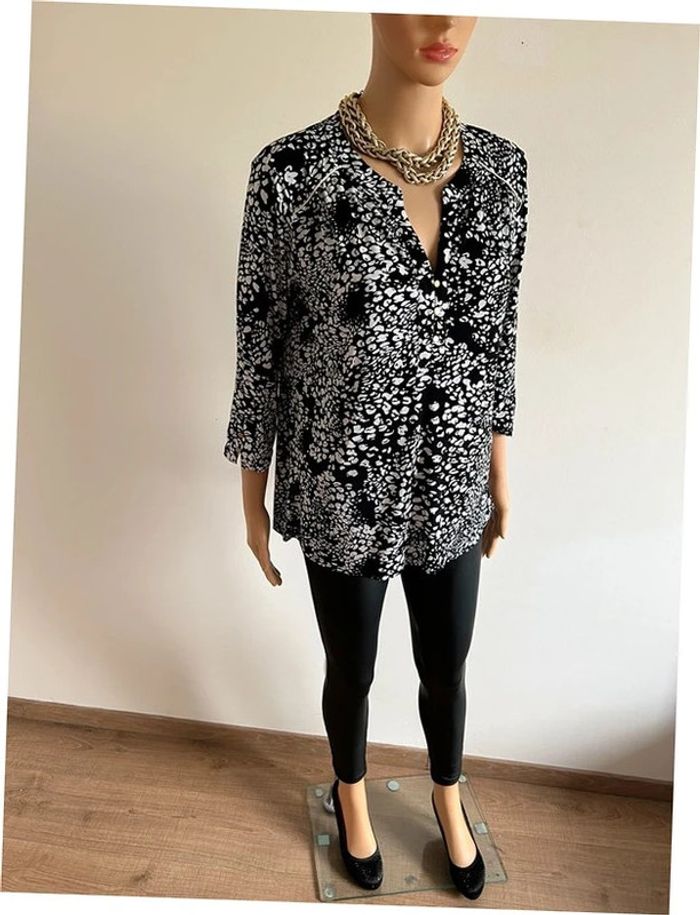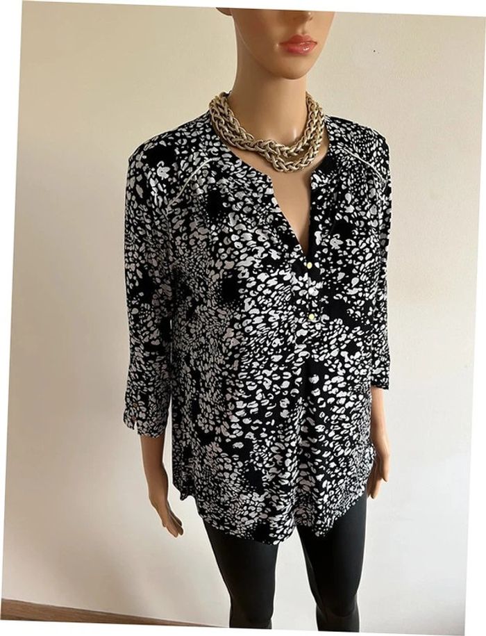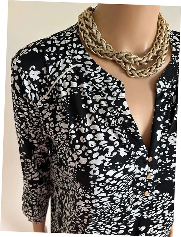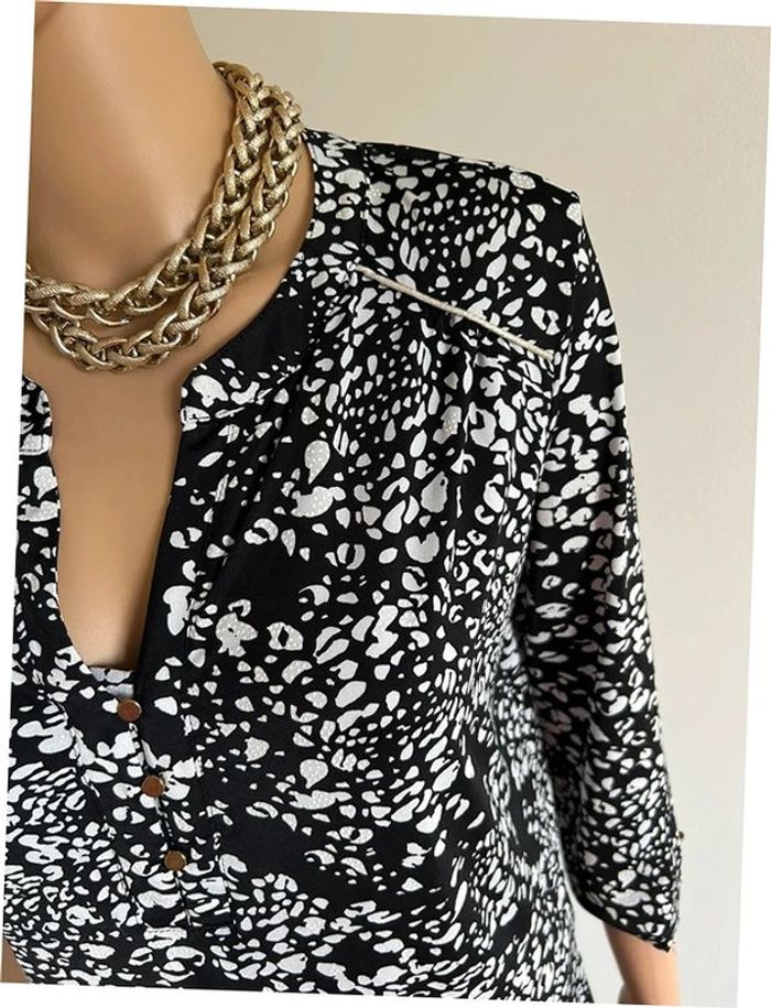 Jolie blouse imprimée noire et blanche, avec manches 3/4, de marque Breal. Correspond à une taille 36 (étiquette de taille coupée, voir mesures en dessous). Peu portée, en excellent état. aisselle à aisselle 52 cms et plus épaule à épaule 42 cms et plus taille 48 cms et plus longueur depuis épaule 63 cms Le tissu est extensible Étiquette intérieure de composition coupée Le prix reste négociable dans la limite du raisonnable. Un petit cadeau dans le colis 🌸 (Boîte 3)