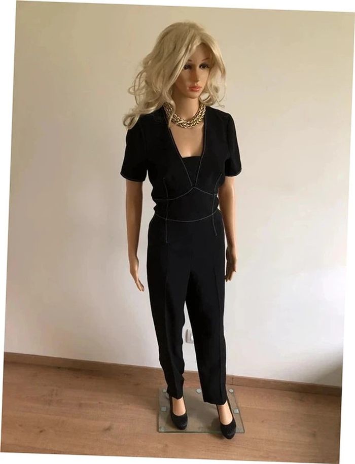 Magnifique combinaison noire à manches courtes, avec coutures blanches, de marque Morgan. Taille 40 qui taille petit et conviendrait plutôt pour un 38. Fermeture dans le dos. Elle est neuve avec étiquette (valeur 85€). aisselle à aisselle 45 cms épaule à épaule 38 cms taille 40 cms longueur depuis épaule 150 cms 100% polyester Le prix reste négociable dans la limite du raisonnable. Un petit cadeau dans le colis.