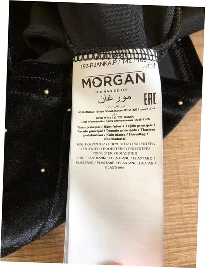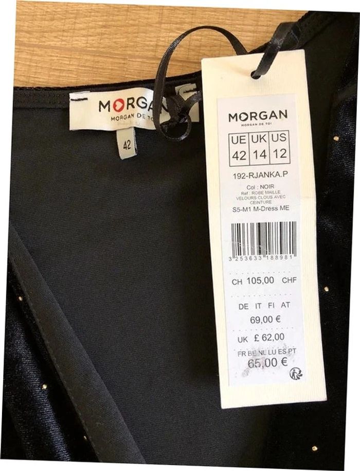 Magnifique robe noire et dorée en velours, sans manches, avec boucle dorée au niveau de la taille, de marque Morgan. Taille 42. Elle est neuve avec étiquette (valeur 65€). Jamais portée car trop grande pour moi suite s une perte de poids. aisselle à aisselle 47 cms et plus taille 41 cms et plus longueur depuis épaule 94 cms Le tissu est extensible 90% polyester et 10% elasthanne Le prix reste négociable dans la limite du raisonnable. Un petit cadeau dans le colis.