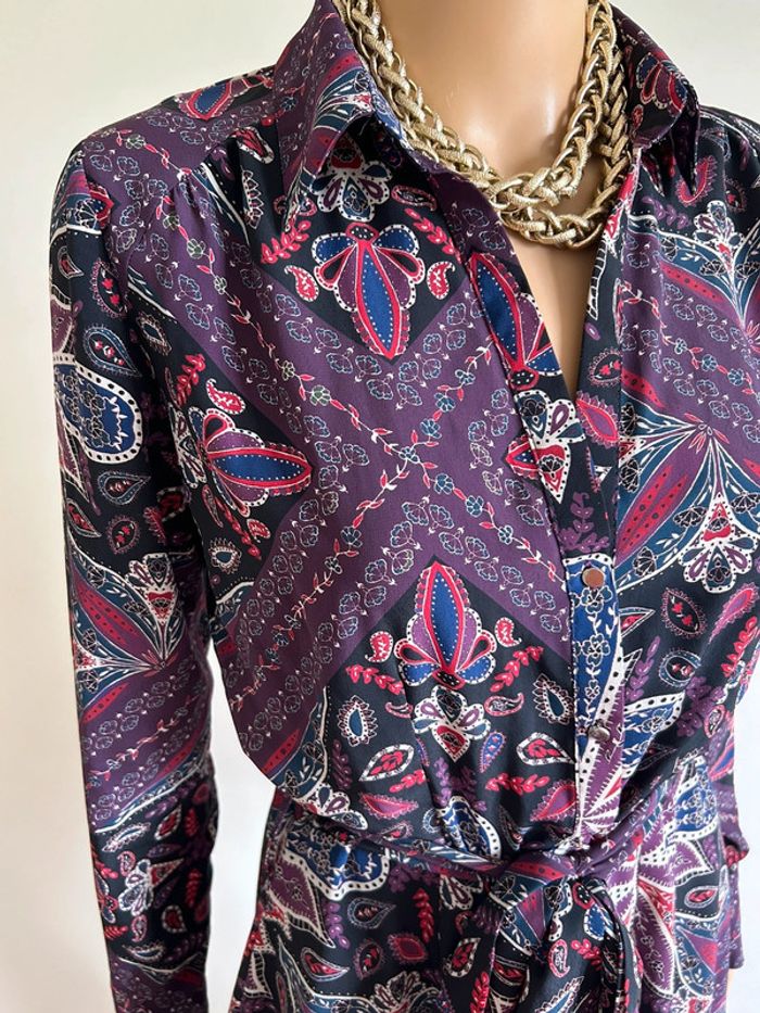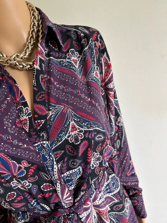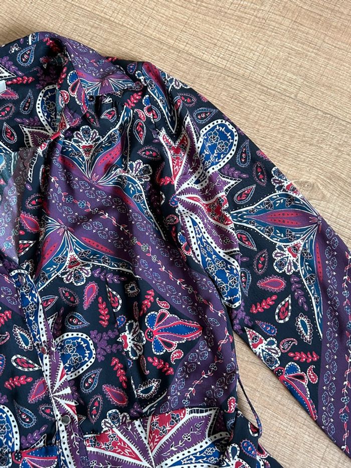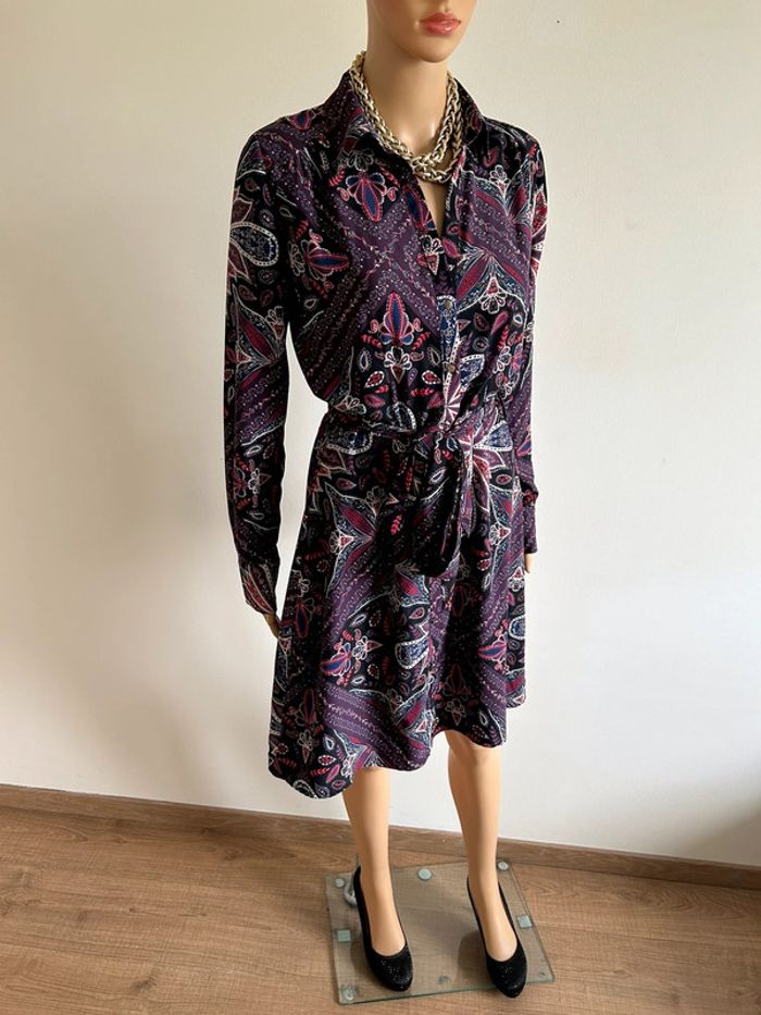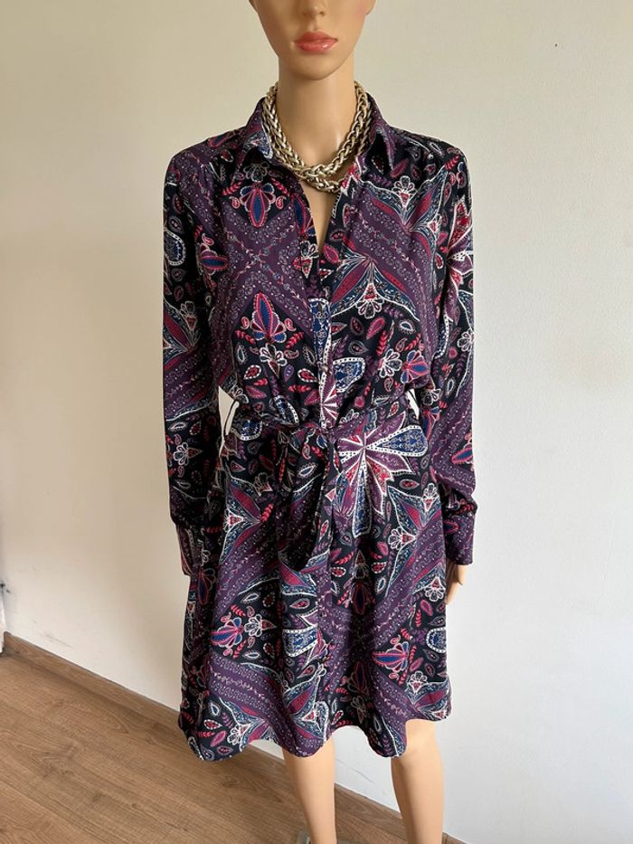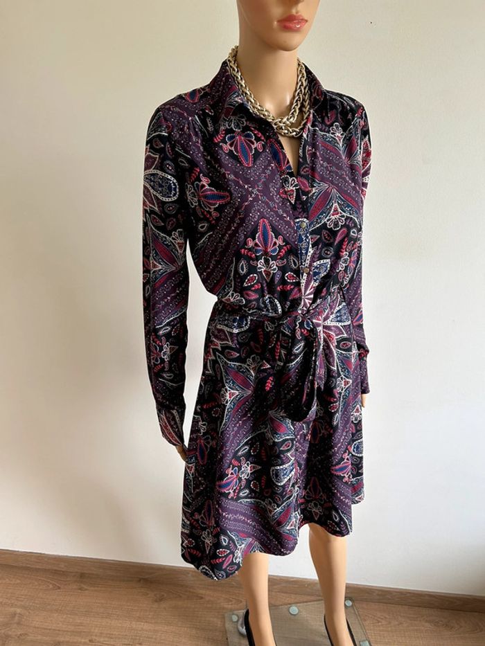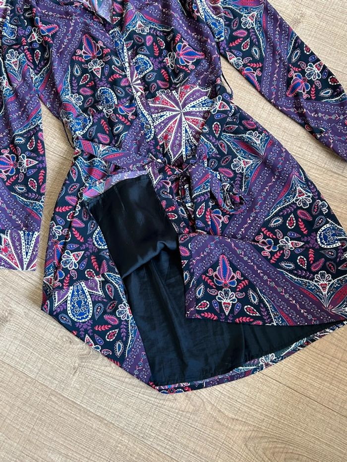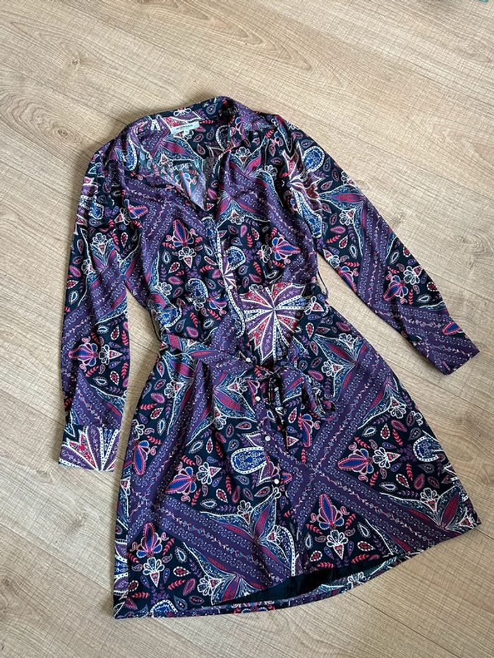 Magnifique robe violette et imprimée à manches longues, de marque Morgan. Boutons sur tout le devant de la robe et ceinture à nouer à la taille. Indiquée taille 40 mais taille vraiment petit, et conviendrait plutôt pour un 36 (voir mesures en dessous). Peu portée, en très bon état. aisselle à aisselle 49 cms épaule à épaule 37 cms longueur manches 61 cms taille 36 cms longueur depuis épaule 93 cms Étiquette intérieure de composition coupée. Le prix reste négociable dans la limite du raisonnable. Un petit cadeau dans le colis 🌸 (Boîte 21)