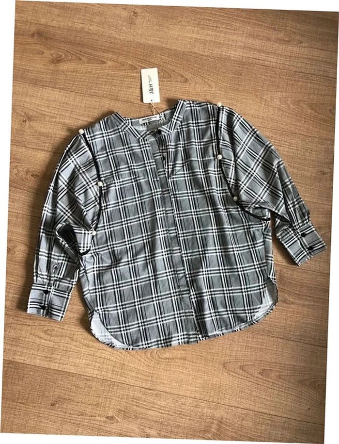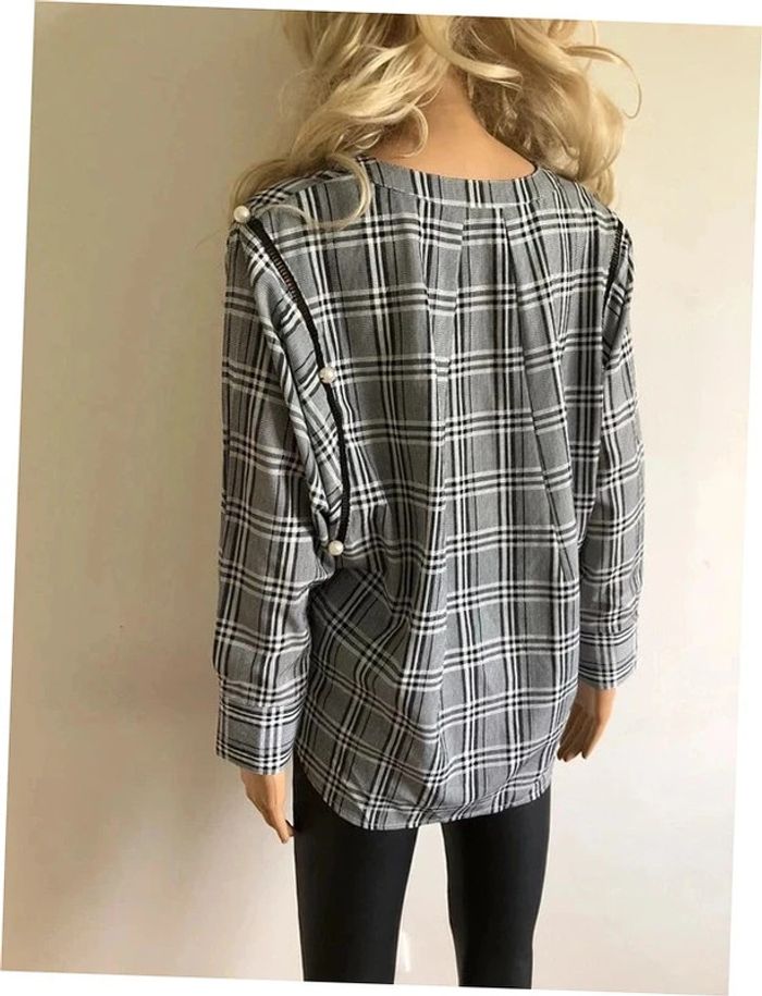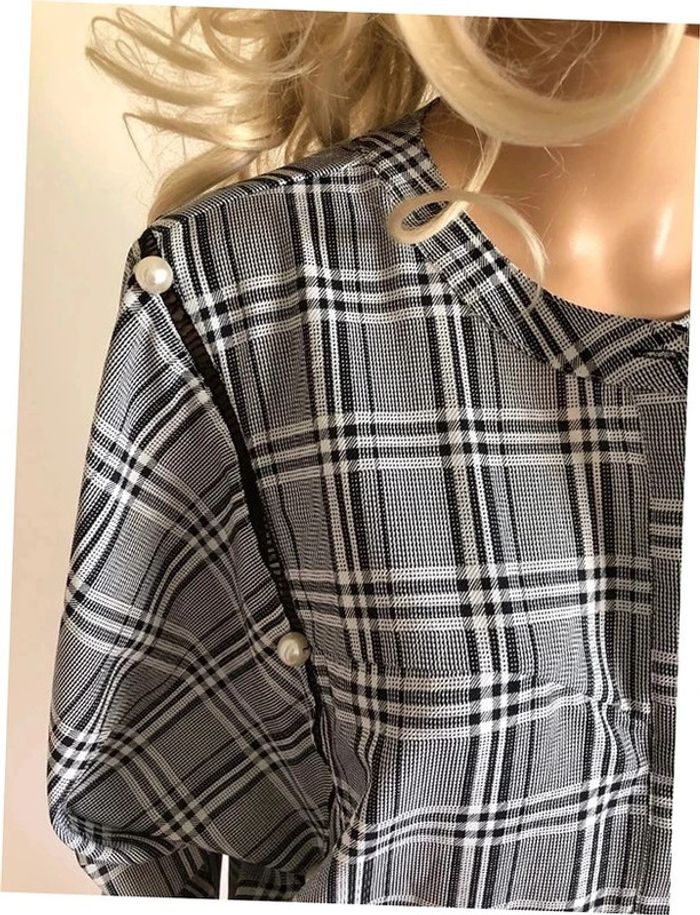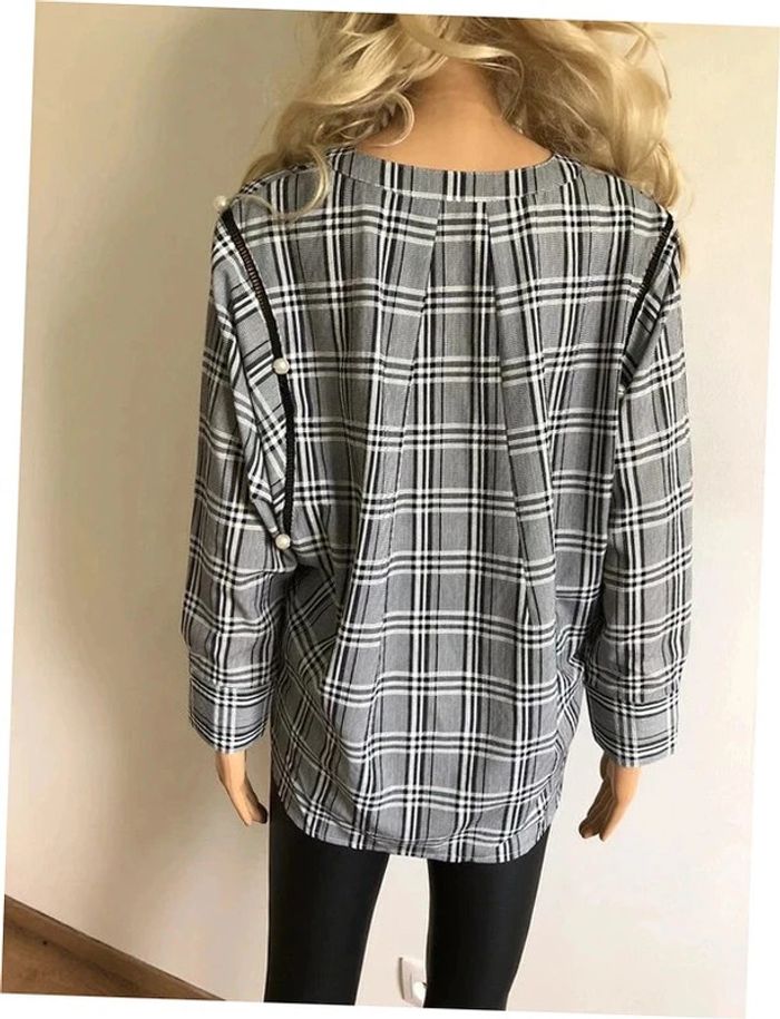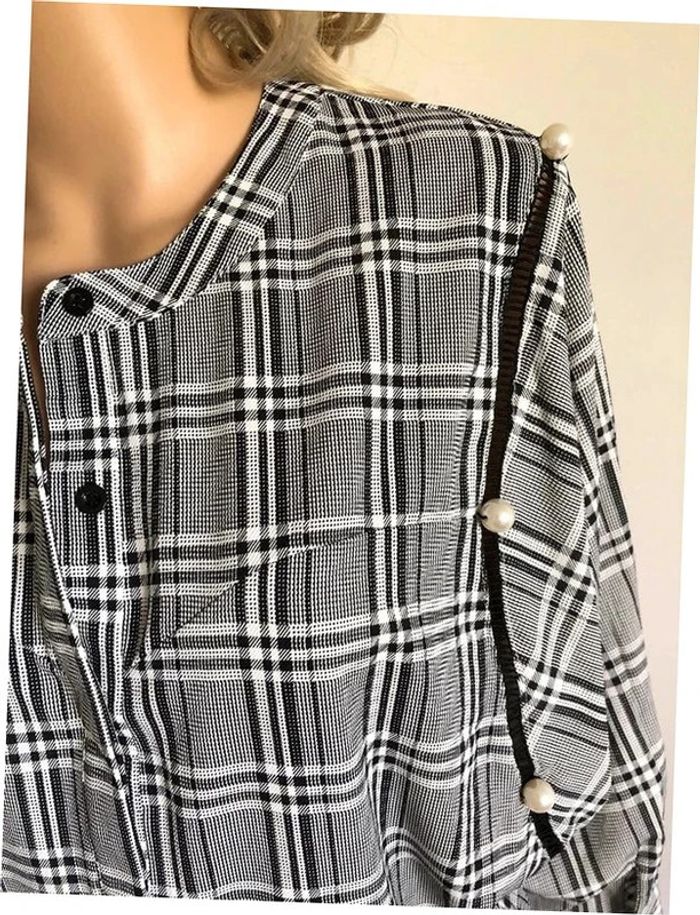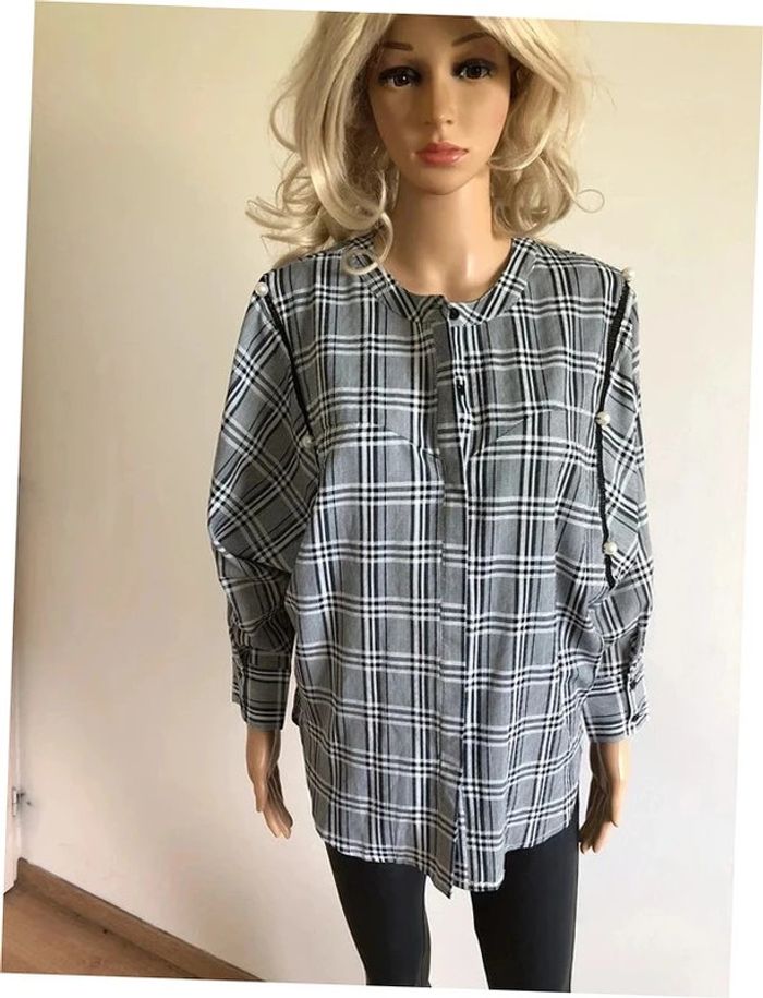 Jolie chemise à carreaux noire et blanche, manches chauve souris, avec perles nacrées. Taille S/M. Elle est neuve avec étiquette. aisselle à aisselle 56 cms épaule à épaule 42 cms taille 51 cms longueur depuis épaule 67 cms 100% polyester Le prix reste négociable dans la limite du raisonnable. Un petit cadeau dans le colis.