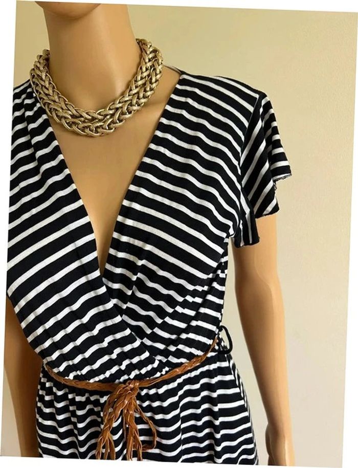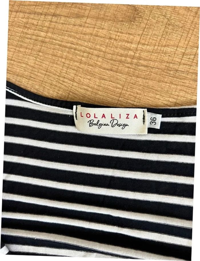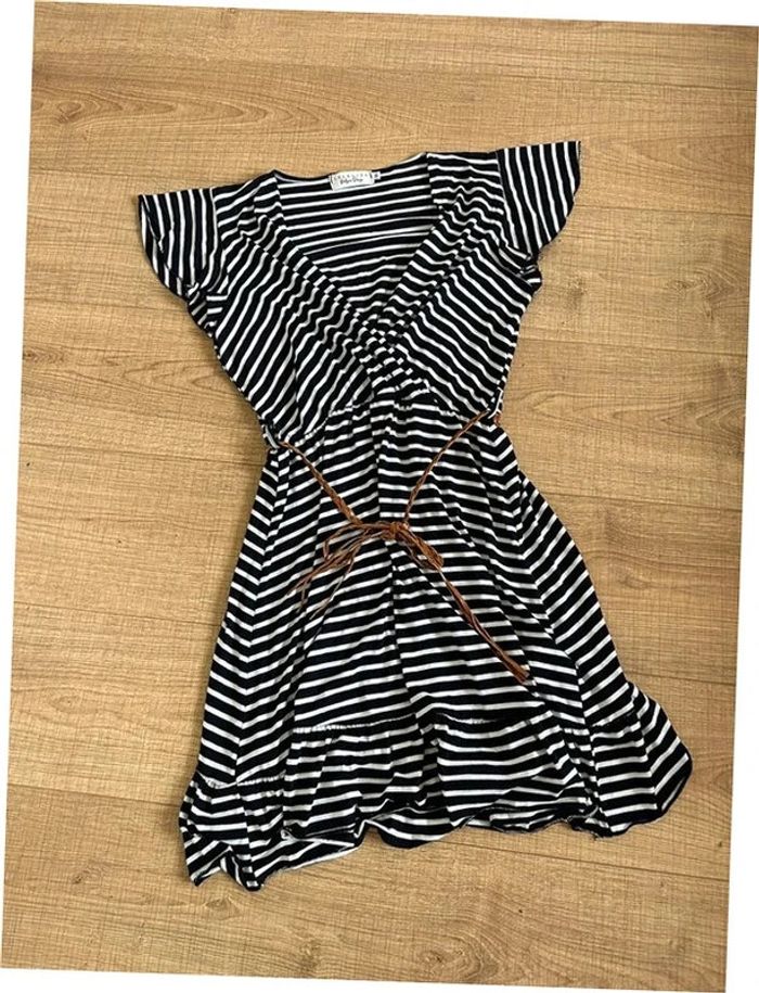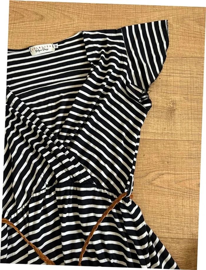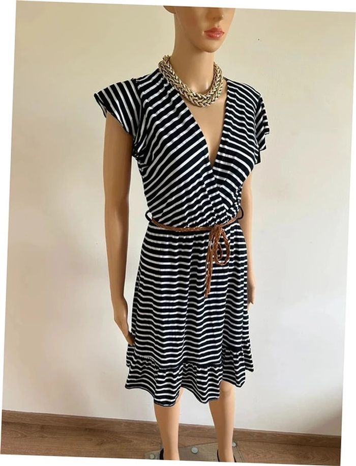 Jolie robe rayée bleue marine et blanche à manches courtes, avec petite ceinture marron en simili cuir, de marque LolaLiza. Taille 36. Jamais portée, état neuf. aisselle à aisselle 40 cms à 57 cms épaule à épaule 37 cms et plus taille 31 cms à 48 cms longueur depuis épaule 87 cms Le tissu est extensible 95% viscose et 5% elasthanne Le prix reste négociable dans la limite du raisonnable. Un petit cadeau dans le colis 🌸 (Boîte 39)