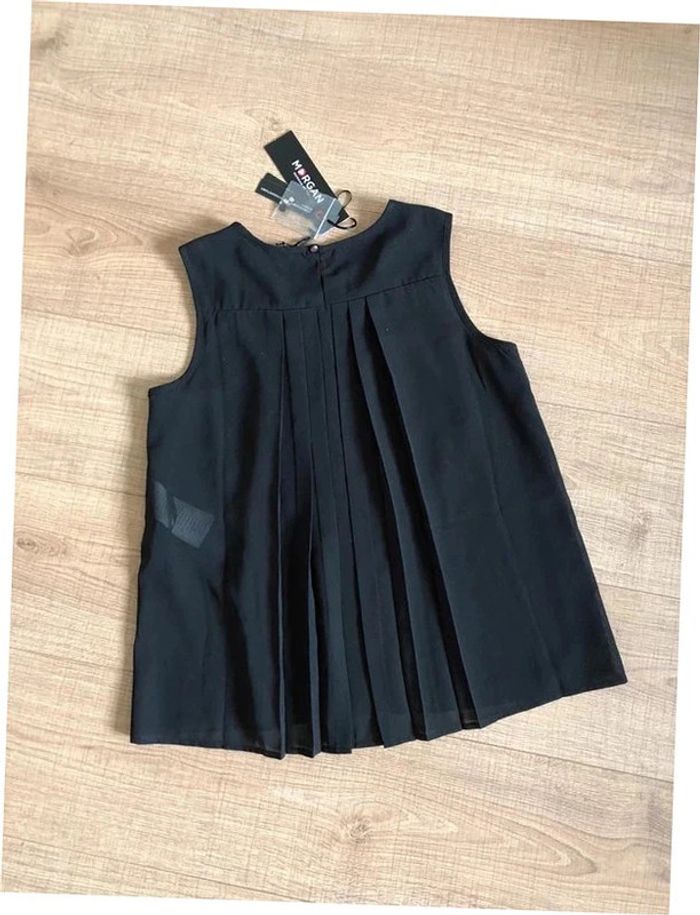 Magnifique blouse noire sans manches, avec strass sur le devant, de marque Morgan. Plissée dans le dos. Taille 36. Elle est neuve avec étiquette (valeur 39€). Jamais portée car trop petite pour moi. aisselle à aisselle 42 cms taille 45 cms longueur depuis épaule 60 cms 100% polyester Le prix reste négociable dans la limite du raisonnable. Un petit cadeau dans le colis.
