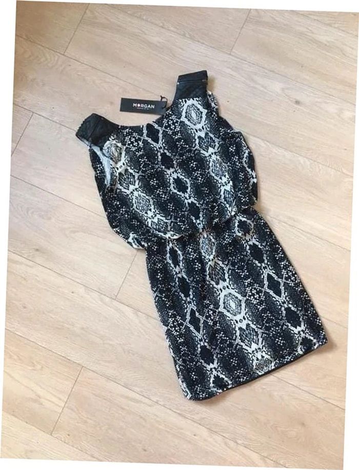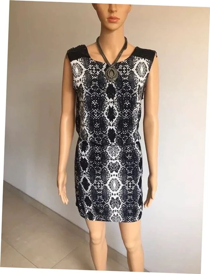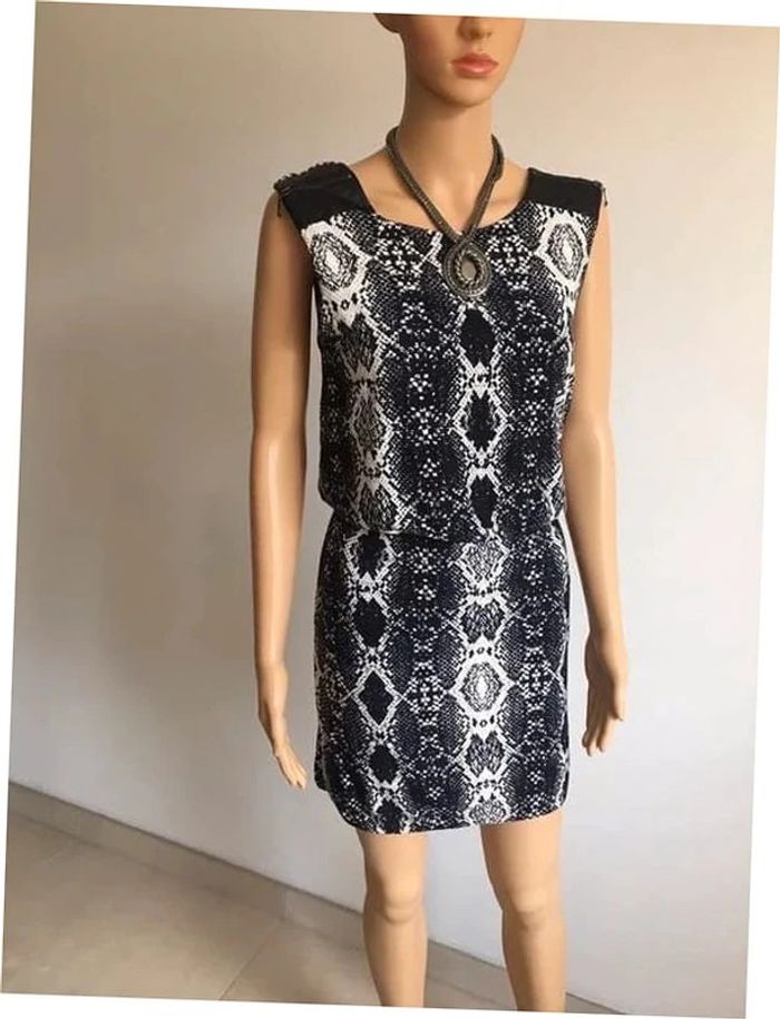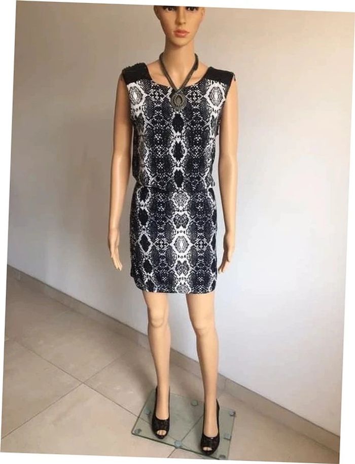 Robe noire et blanche, sans manches, avec imprimé animal et empiècements en simili cuir sur les épaules, de marque Morgan. Taille S. Elle est neuve avec étiquette (valeur 55€). aisselle à aisselle 46 cms taille 33 cms à 44 cms longueur depuis épaule 85 cms 90% polyester et 10% elasthanne Le prix reste négociable dans la limite du raisonnable. Un petit cadeau dans le colis.
