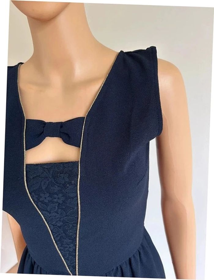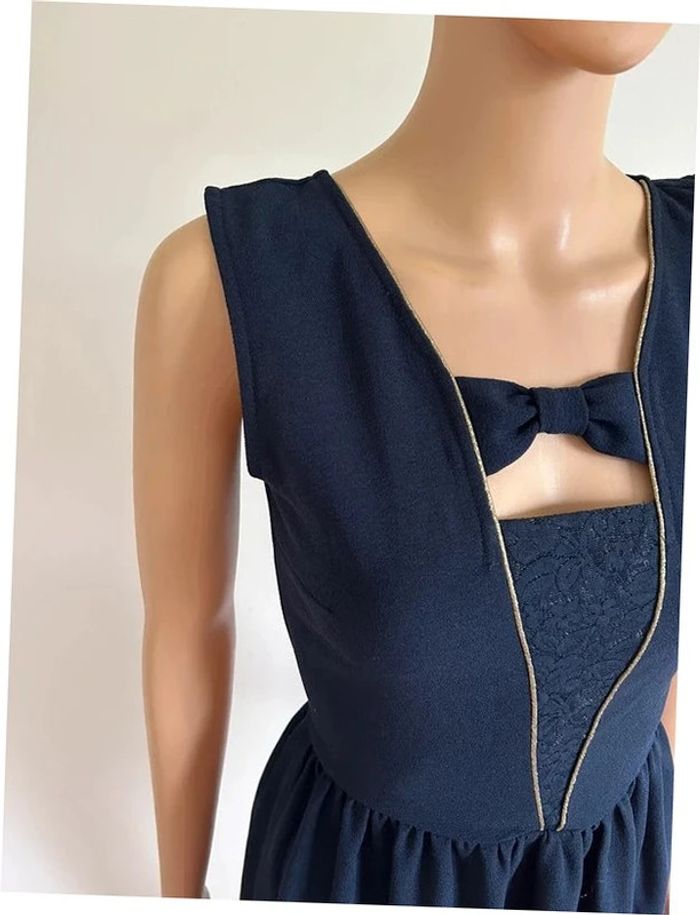 Magnifique robe bleue marine et dorée sans manches, avec dentelle, de marque Naf Naf. Fermeture dans le dos. Taille 34. Jamais portée, état neuf. aisselle à aisselle 42 cms taille 34 cms longueur depuis épaule 87 cms 95% polyester et 5% elasthanne Le prix reste négociable dans la limite du raisonnable. Un petit cadeau dans le colis 🌸 (Boîte 49)