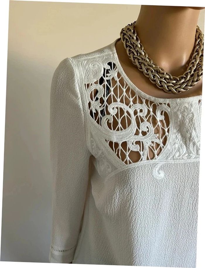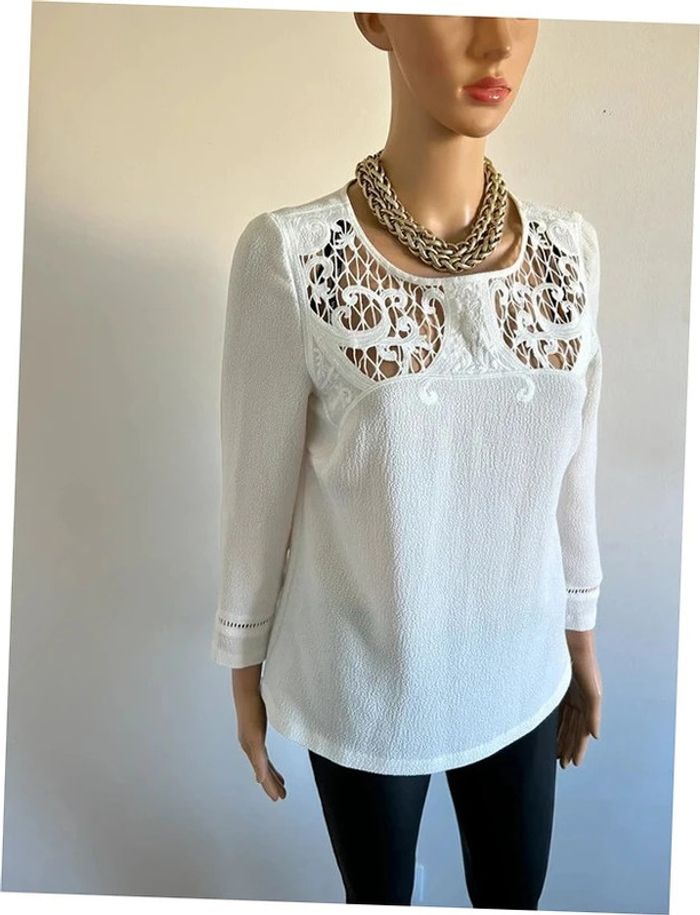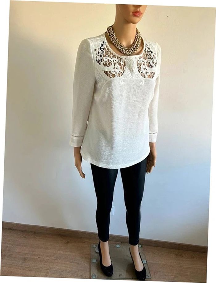 Magnifique blouse blanche avec dentelle, manches 3/4, de marque Morgan. Taille 36. Jamais portée, état neuf. aisselle à aisselle 44 cms épaule à épaule 36 cms taille 43 cms longueur depuis épaule 61 cms 98% polyester et 2% elasthanne Le prix reste négociable dans la limite du raisonnable. Un petit cadeau dans le colis 🌸