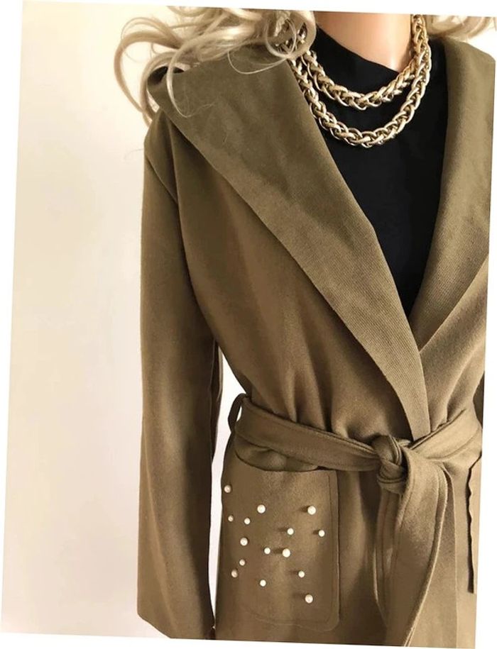 Manteau mi long kaki avec capuche et noeud à nouer à la taille, perles nacrées sur les poches du devant. Taille unique qui convient jusqu’au 40/42. Il est neuf avec étiquette. longueur depuis épaule environ 102 cms longueur manches 59 cms 80% polyester, 18% acrylique et 2% elasthanne Le prix reste négociable dans la limite du raisonnable. Un petit cadeau dans le colis.