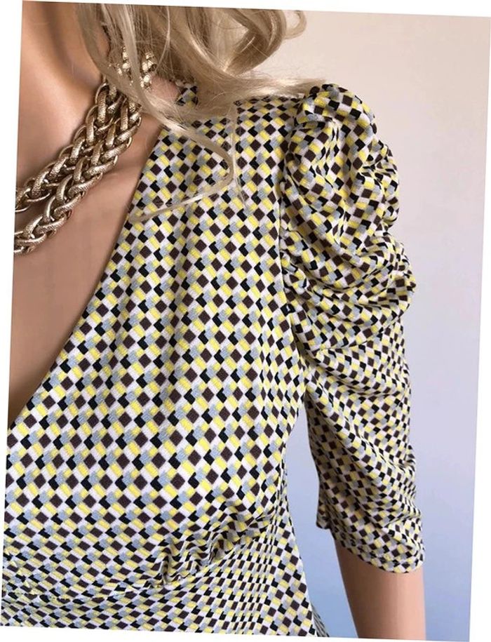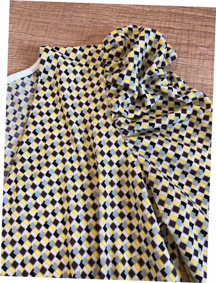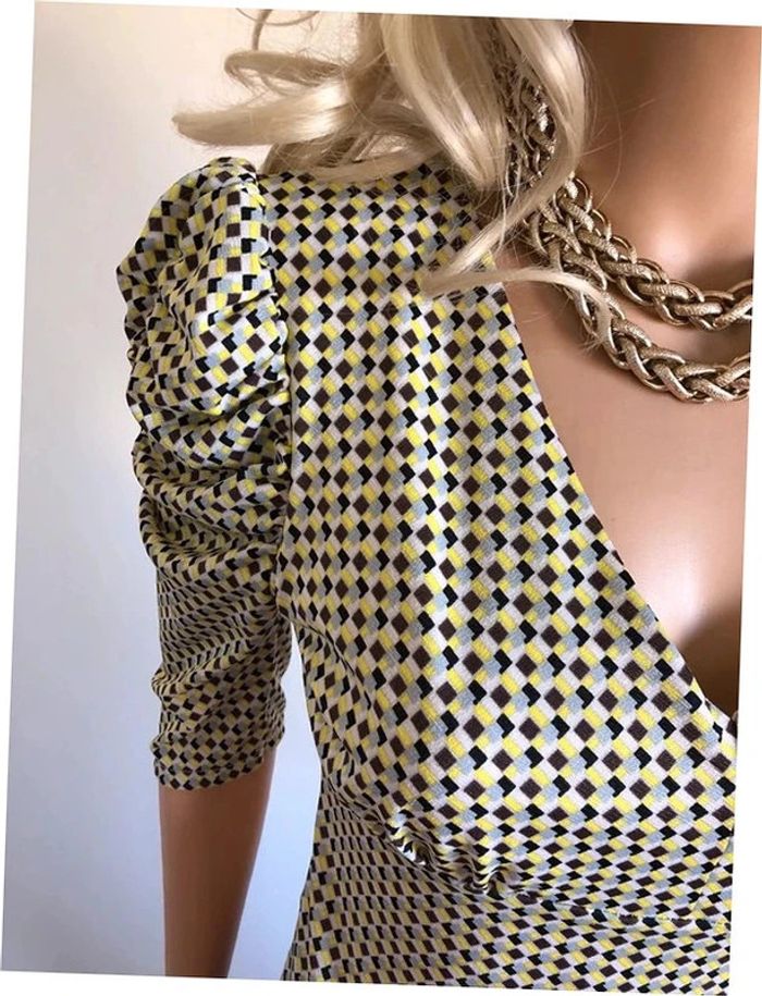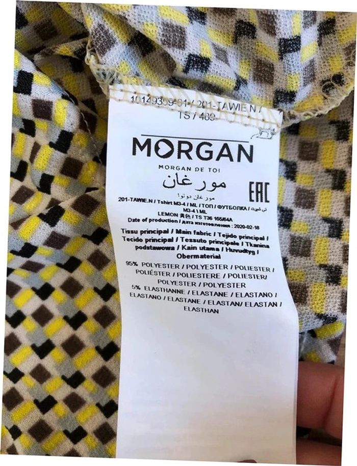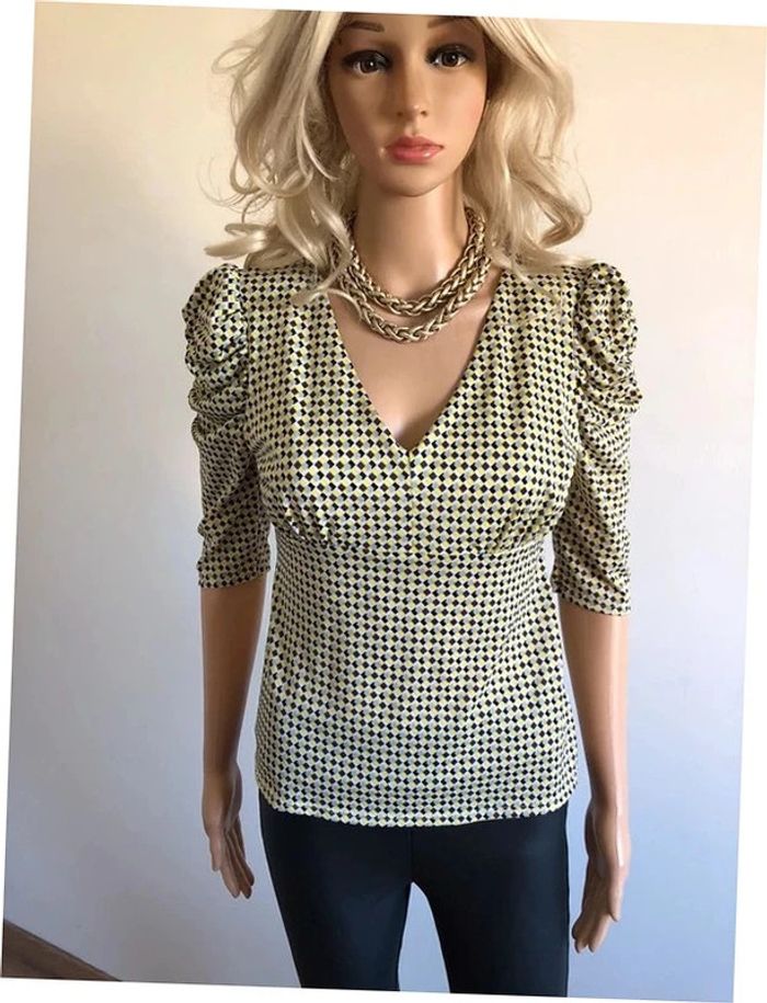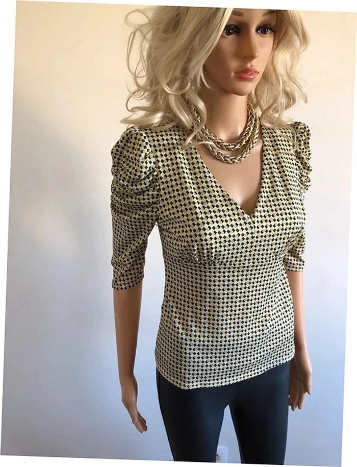 Jolie blouse jaune et multicolore, à manches courtes, de marque Morgan. Taille S. Elle est neuve avec étiquette (valeur 35€). aisselle à aisselle 42 cms et plus épaule à épaule 37 cms et plus taille 35 cms et plus longueur depuis épaule 54 cms Le tissu est extensible 95% polyester et 5% elasthanne Le prix reste négociable dans la limite du raisonnable. Un petit cadeau dans le colis.