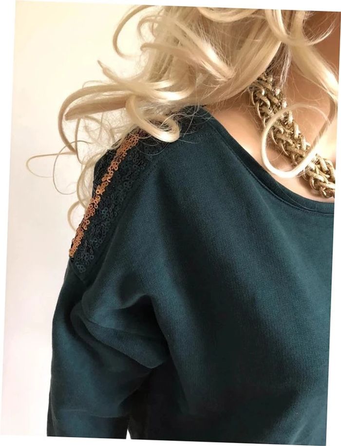 Magnifique robe pull sweat verte foncée, de marque Esprit. Sequins verts foncés et dorés sur les épaules. Manches 3/4 Taille M. Très peu portée, en excellent état. aisselle à aisselle 57 cms taille 46 cms longueur 88 cms Le tissu est extensible Étiquette intérieure de composition coupée Le prix reste négociable dans la limite du raisonnable. Un petit cadeau dans le colis. (Boîte 46)