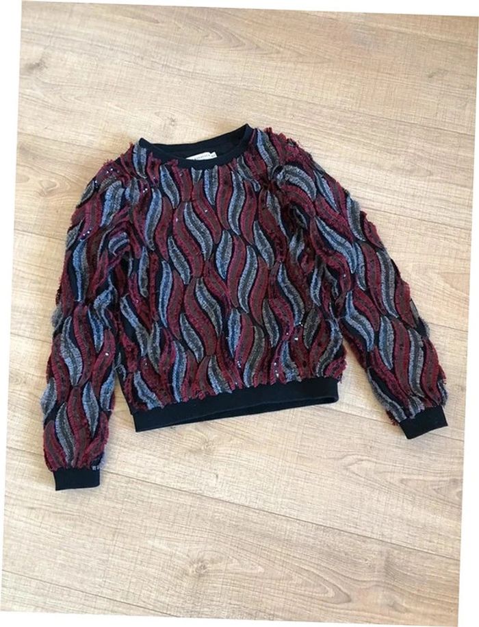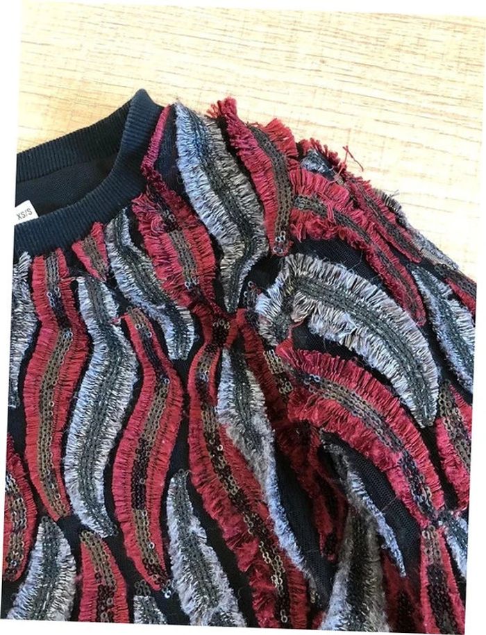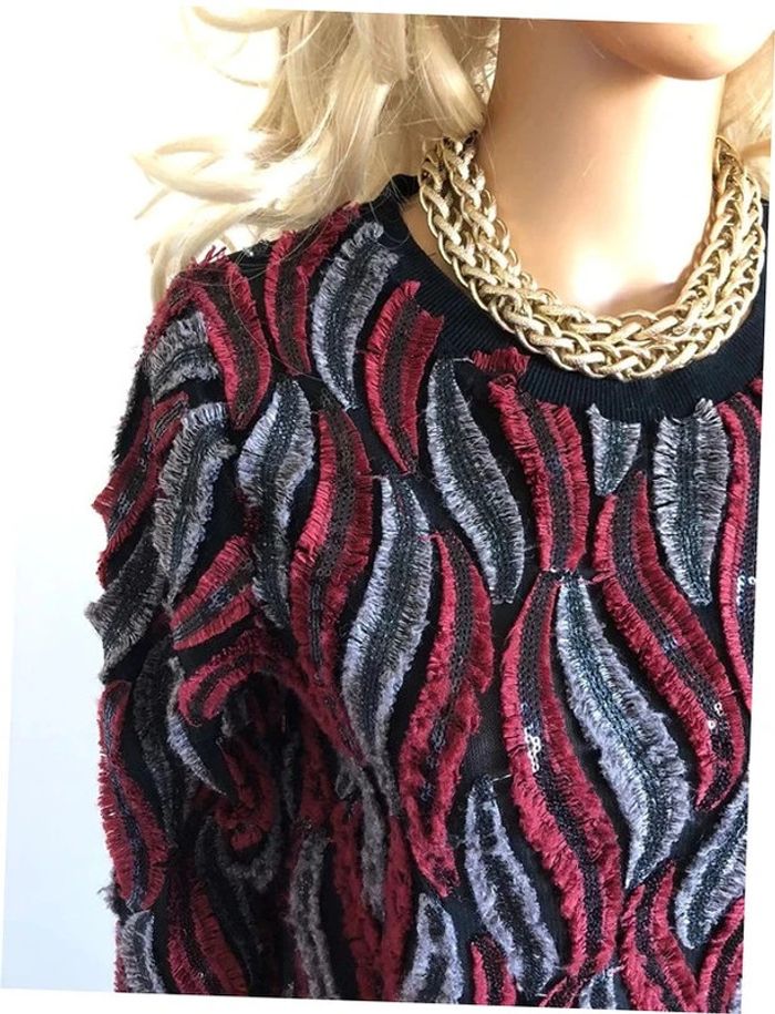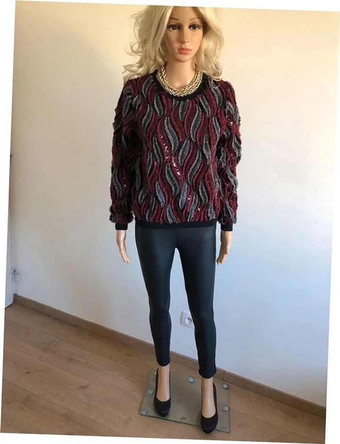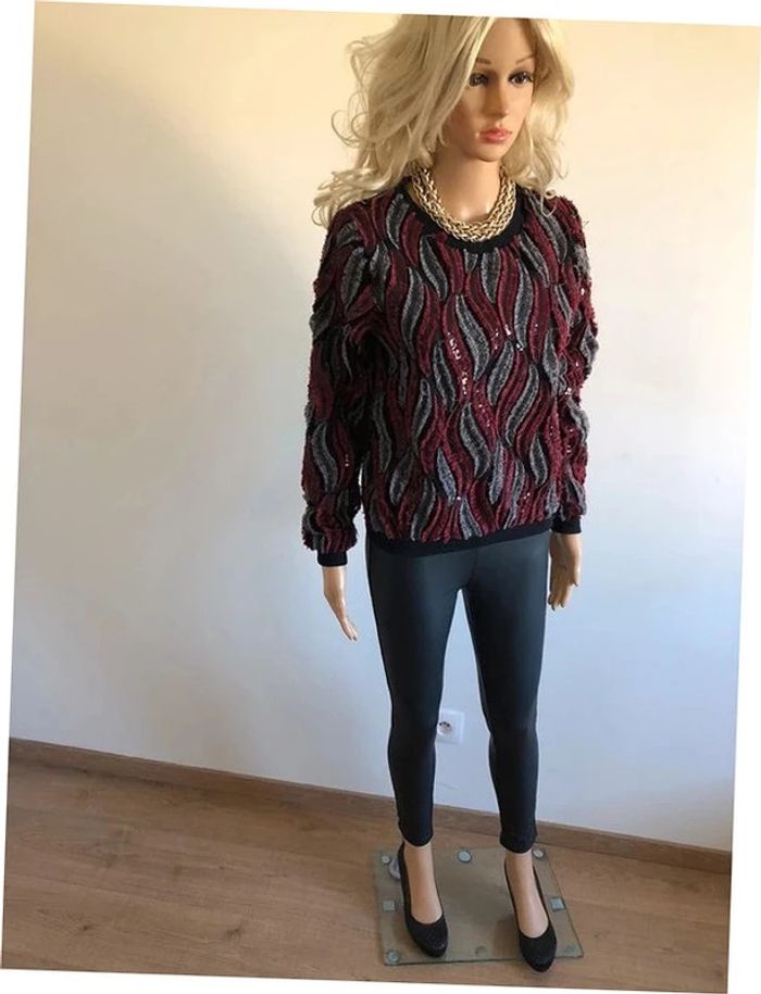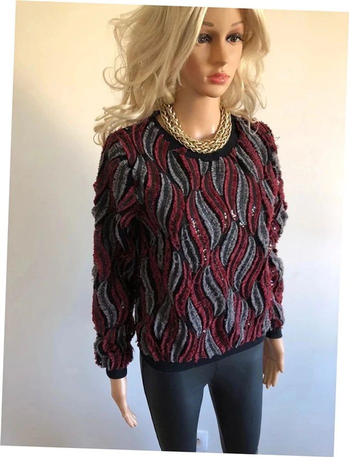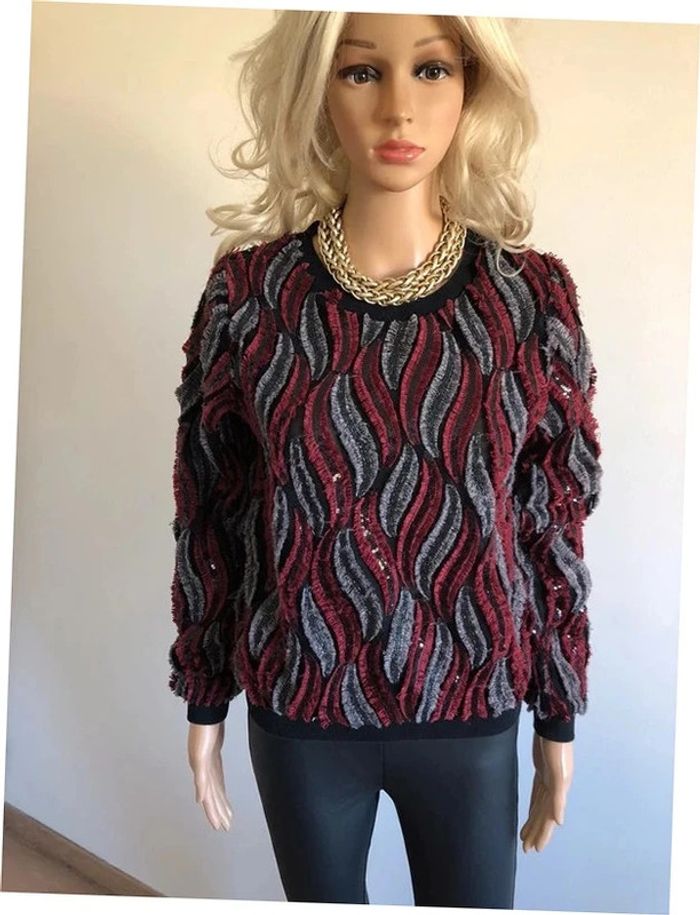 Joli pull noir, rouge et gris, avec des sequins, de marque Molly Bracken. Taille XS / S. Porté quelques fois, en très bon état aisselle à aisselle 46 cms épaule à épaule 36 cms longueur manches 58 cms taille 42 cms longueur depuis épaule 54 cms 95% polyester et 5% viscose Le prix reste négociable dans la limite du raisonnable. Un petit cadeau dans le colis.