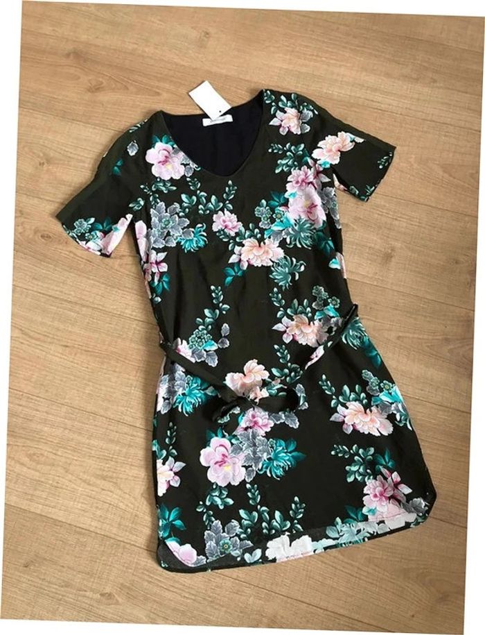Robe verte foncée et imprimée fleurie à manches courtes Promod taille 34 jamais portée - photo numéro 7