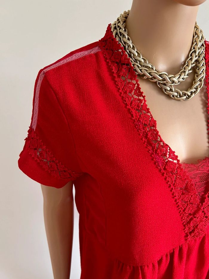 Magnifique robe rouge casual à manches courtes, avec dentelle, de marque Grace & Mila. Taille S. Jamais portée, état neuf. aisselle à aisselle 46 cms épaule à épaule 37 cms taille 45 cms longueur depuis épaule 88 cms Étiquette intérieure de composition effacée Le prix reste négociable dans la limite du raisonnable. Un petit cadeau dans le colis 🌸 (Boîte 32)