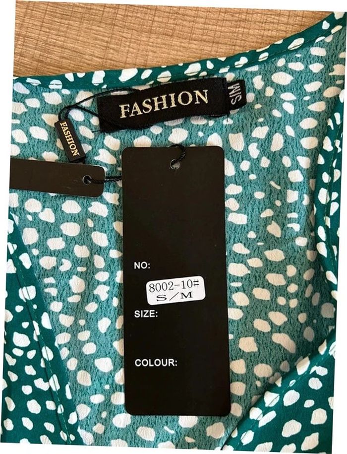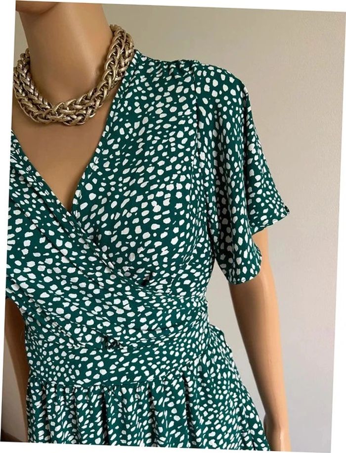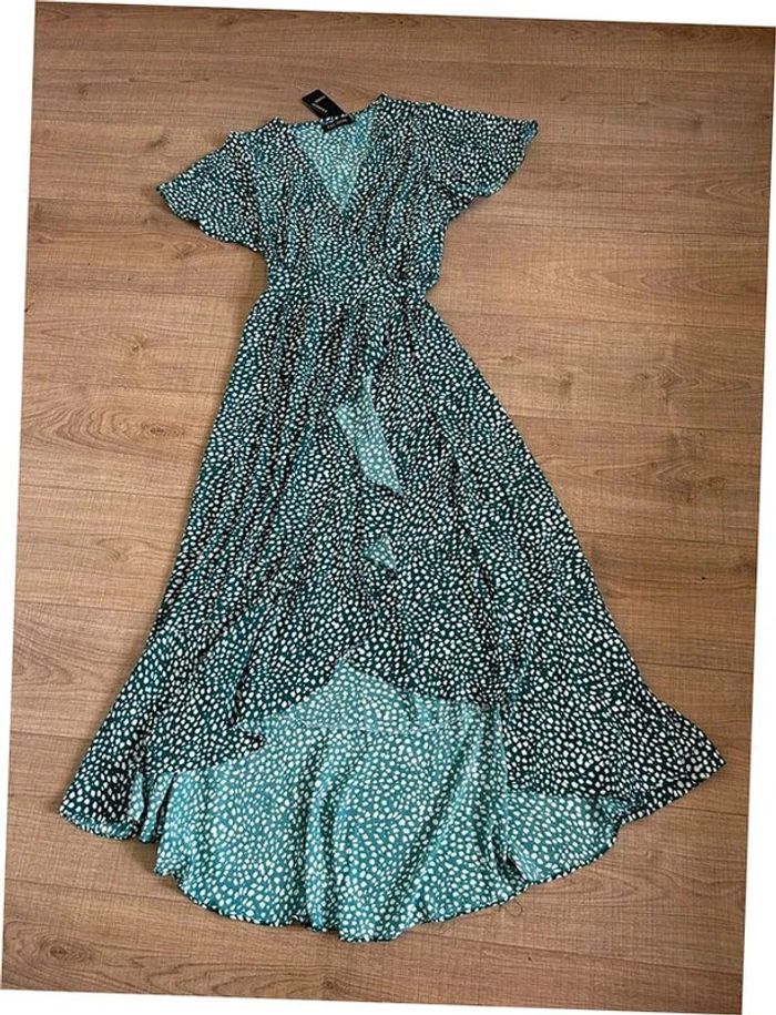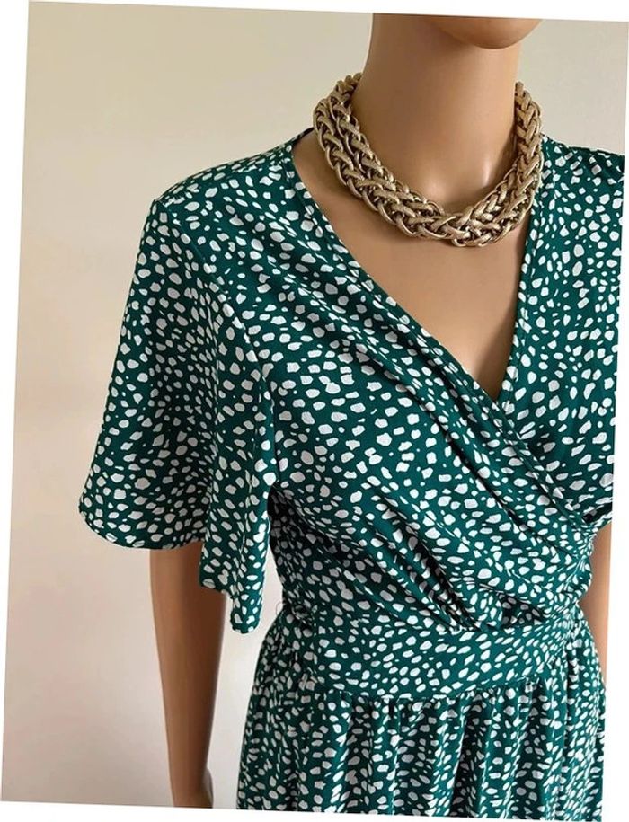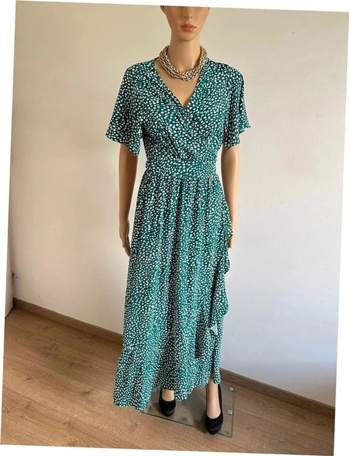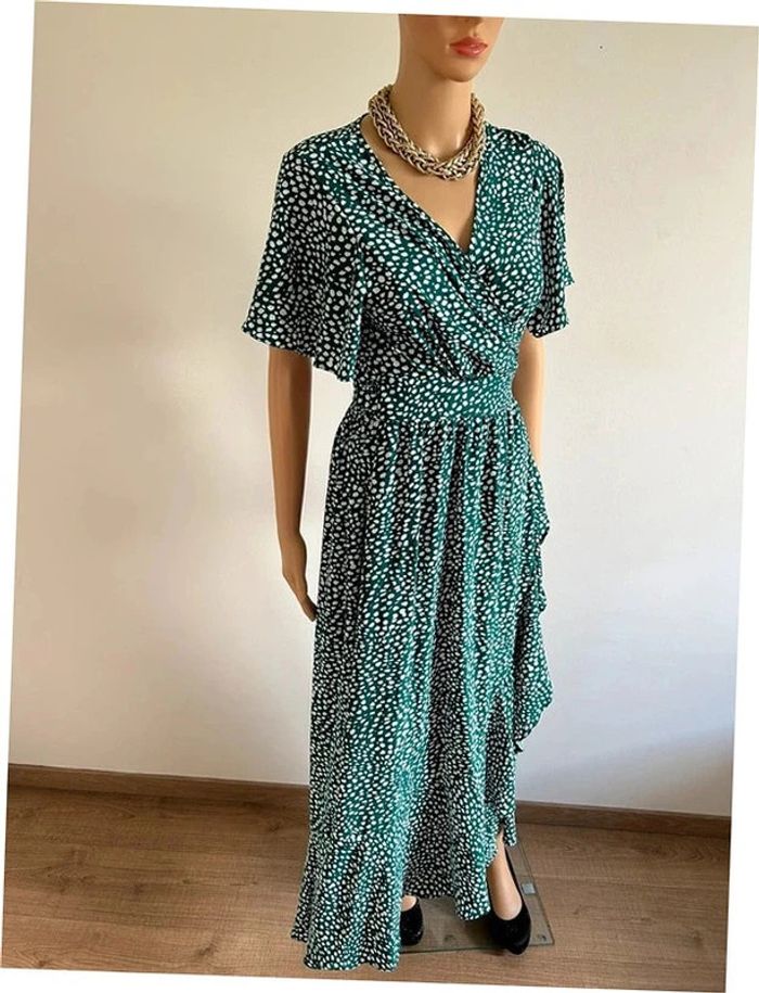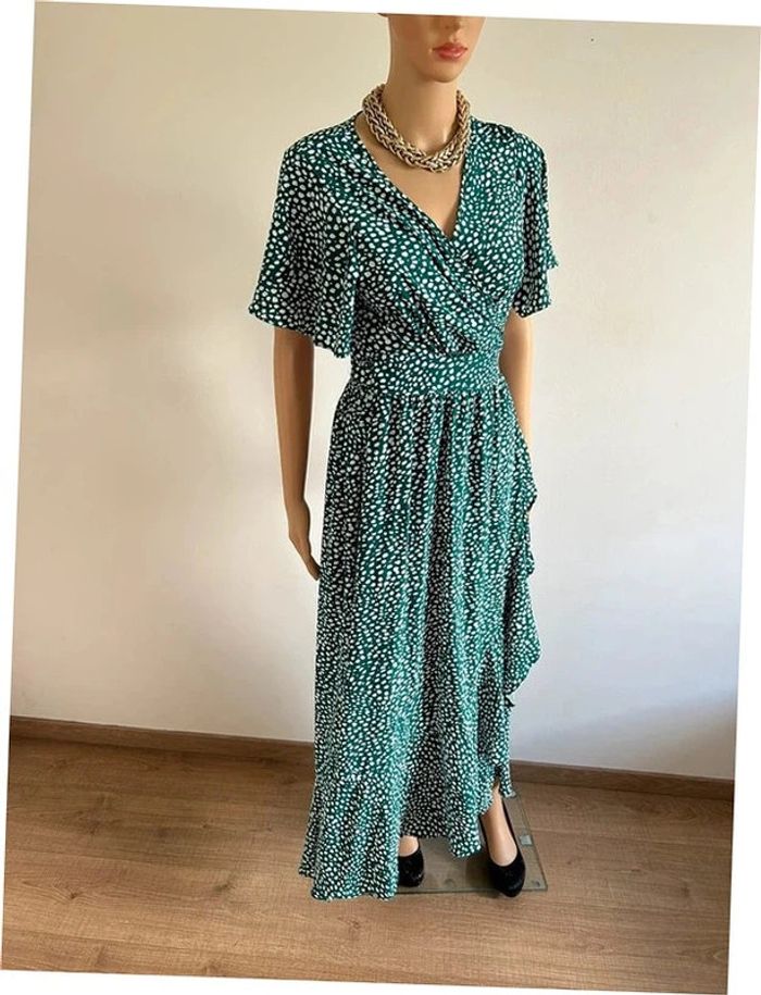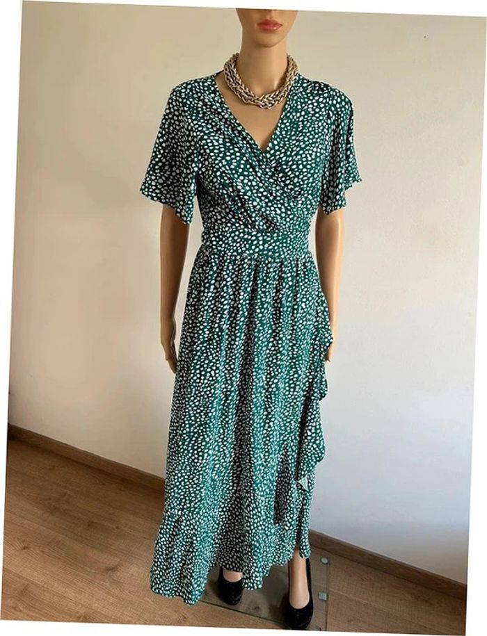 Jolie robe portefeuille longue verte et blanche, à manches courtes, de marque Fashion. Taille S/M. Elle est neuve avec étiquette. aisselle à aisselle 45 cms épaule à épaule 38 cms taille 34 cms et plus longueur avant depuis epaule environ 108 cms longueur arrière depuis épaule environ 144 cms La taille est ajustable 100% polyester Le prix reste négociable dans la limite du raisonnable. Un petit cadeau dans le colis 🌸