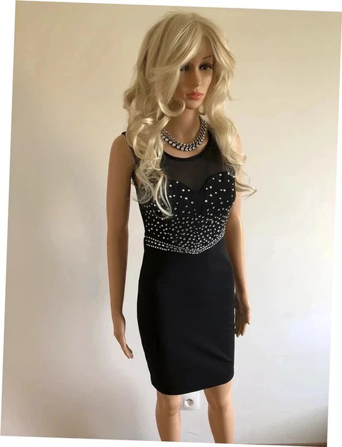 Magnifique robe noire sans manches, avec strass argentés. Fermeture dans le dos. Transparente au niveau du décolleté et du dos. Taille S. Jamais portée, état neuf. aisselle à aisselle 40 cms et plus taille 34 cms et plus longueur depuis épaule 89 cms Le tissu est extensible 93% nylon et 7% elasthanne Le prix reste négociable dans la limite du raisonnable. Un petit cadeau dans le colis 🌸