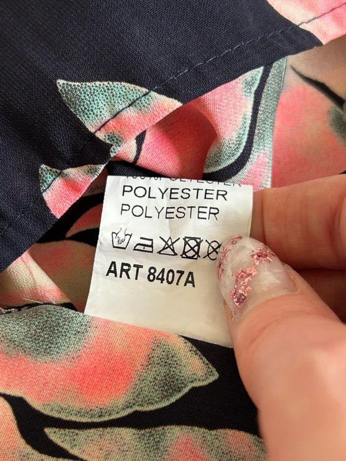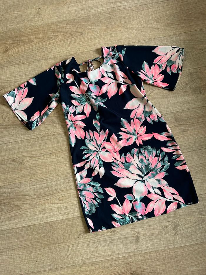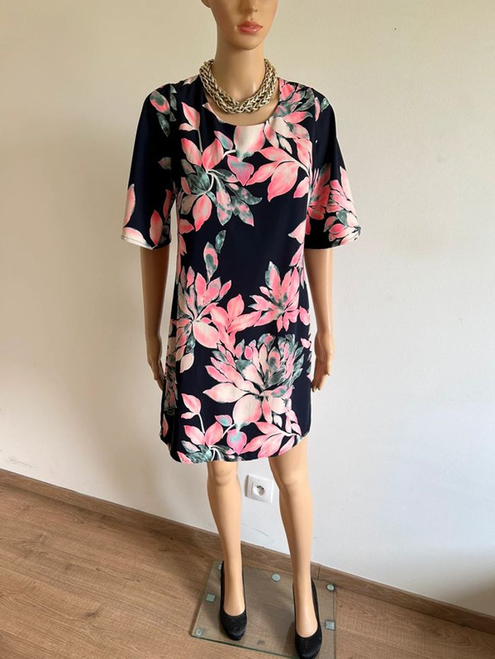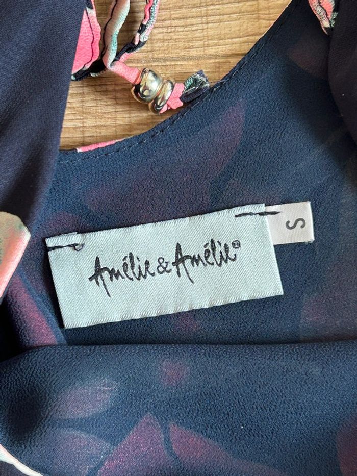 Jolie robe bleue marine et rose imprimée fleurie, à manches courtes, de marque Amélie & Amélie. Taille S. Jamais portée, état neuf. aisselle à aisselle 43 cms taille 42 cms longueur depuis épaule 86 cms 100% polyester Le prix reste négociable dans la limite du raisonnable. Un petit cadeau dans le colis 🌸 (Boîte 38)