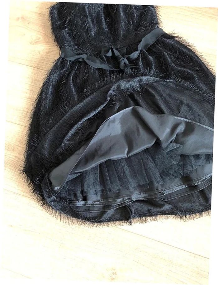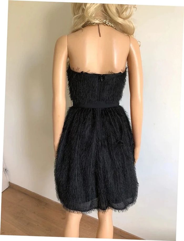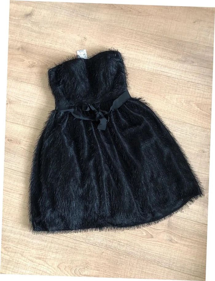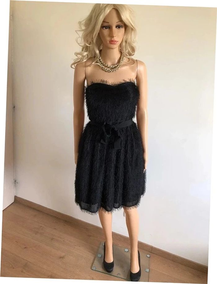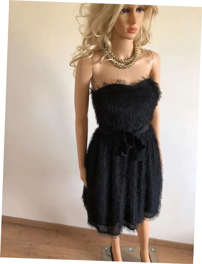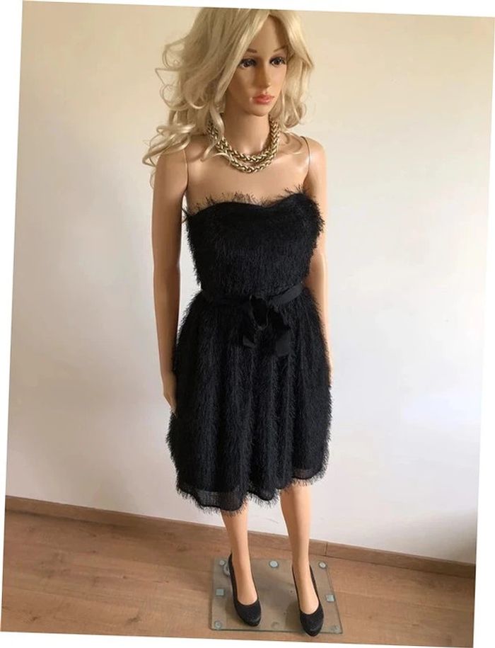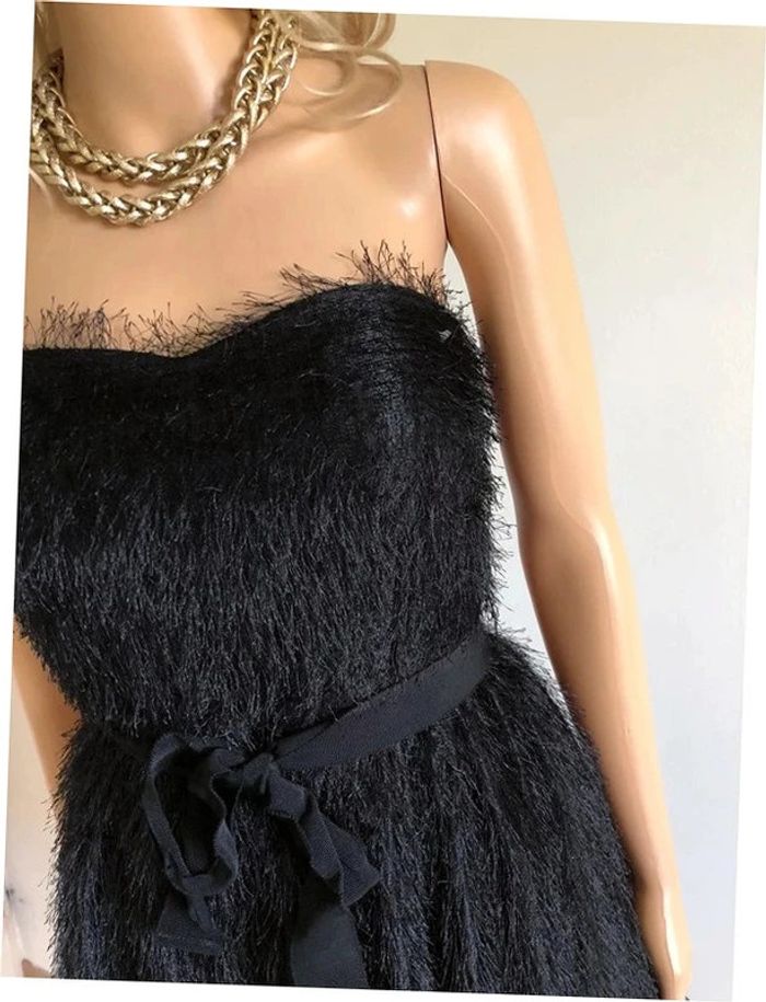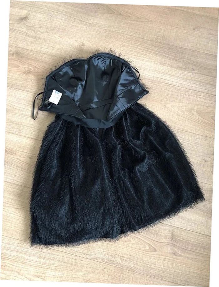 Magnifique robe bustier noire à poils, de marque 123. Taille 34. Fermeture dans le dos. Ruban à nouer à la taille. Elle est neuve avec étiquette. aisselle à aisselle 39 cms taille 34 cms longueur depuis aisselle 73 cms 100% polyester Le prix reste négociable dans la limite du raisonnable. Un petit cadeau dans le colis.