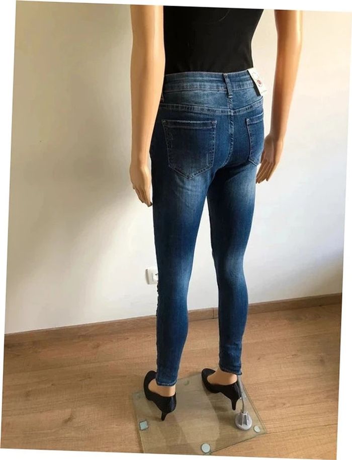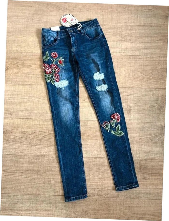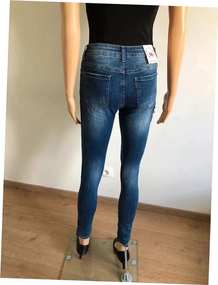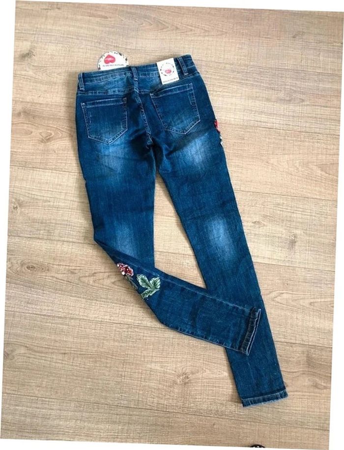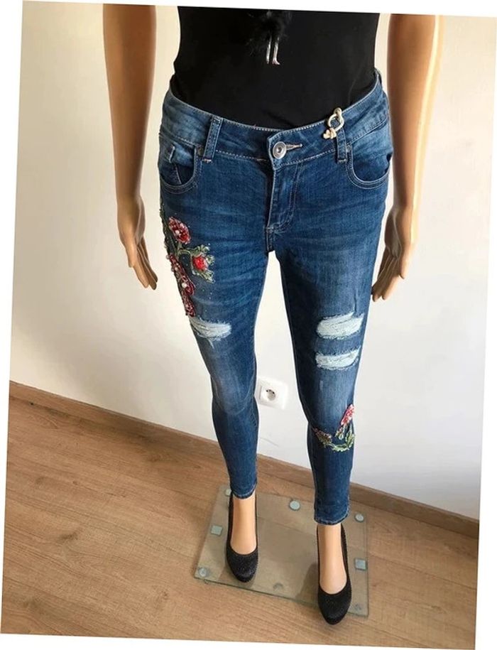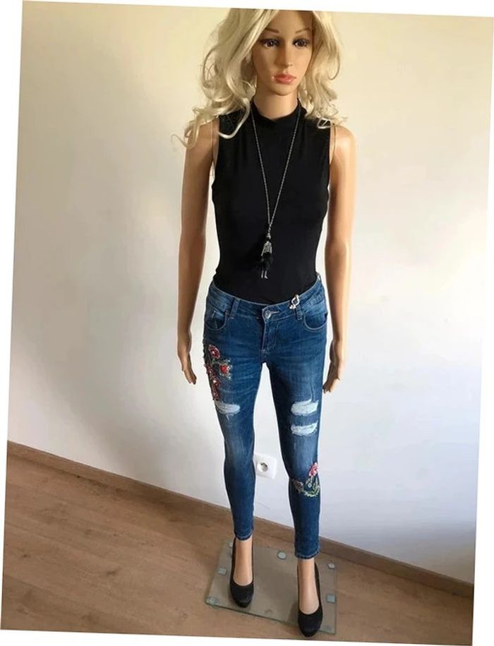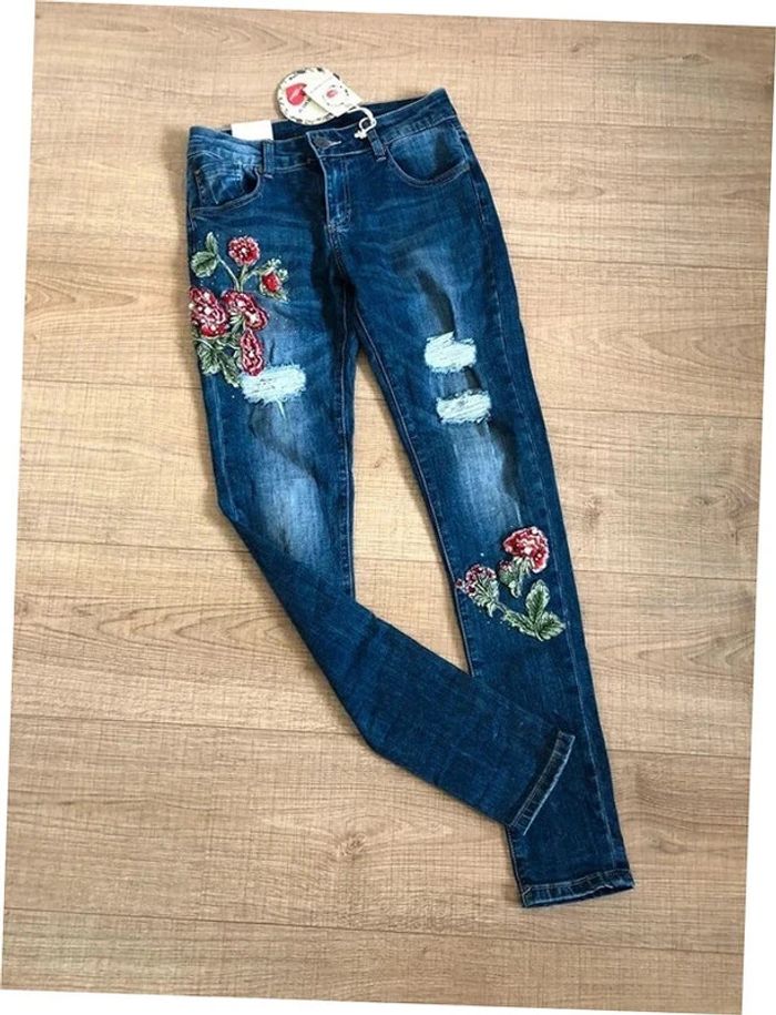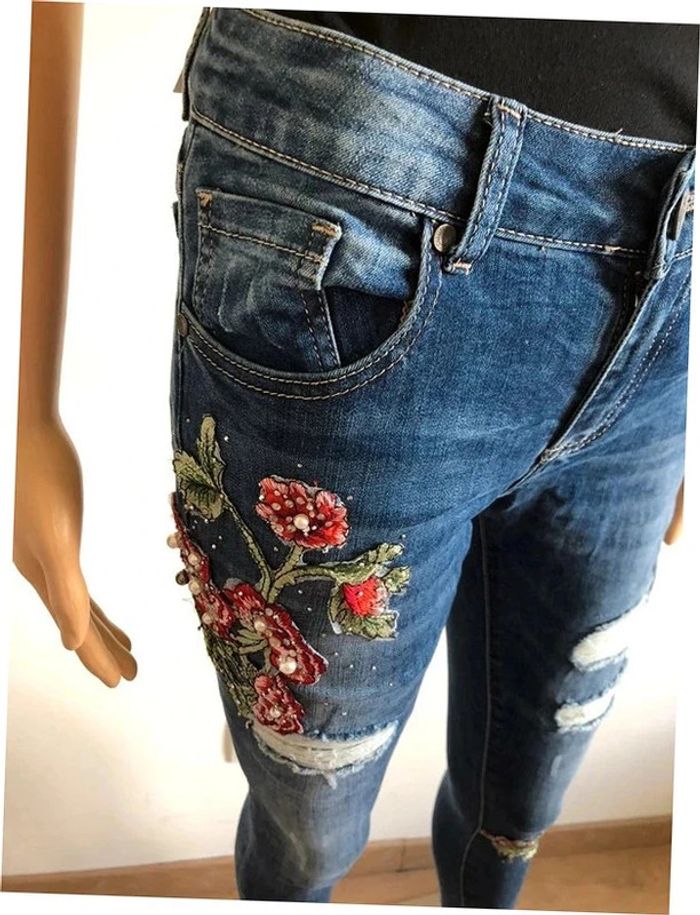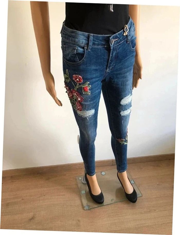 Joli jean skinny bleu foncé avec broderies et strass.
