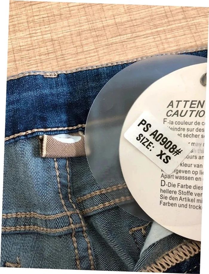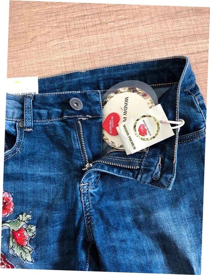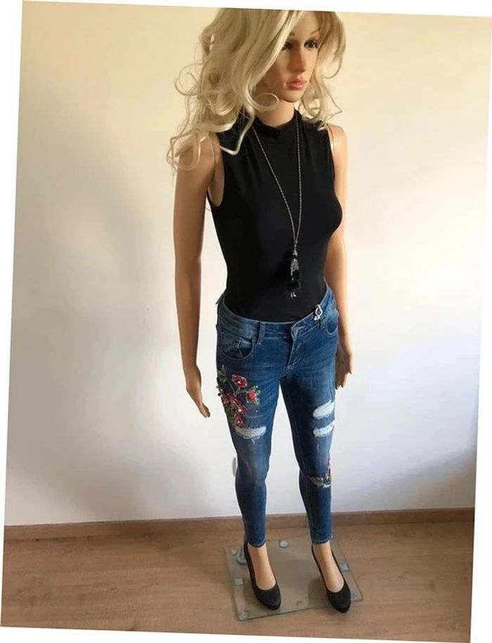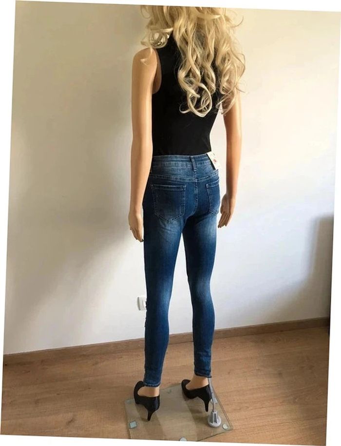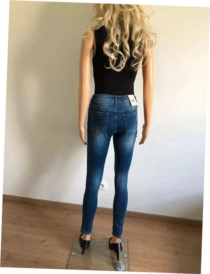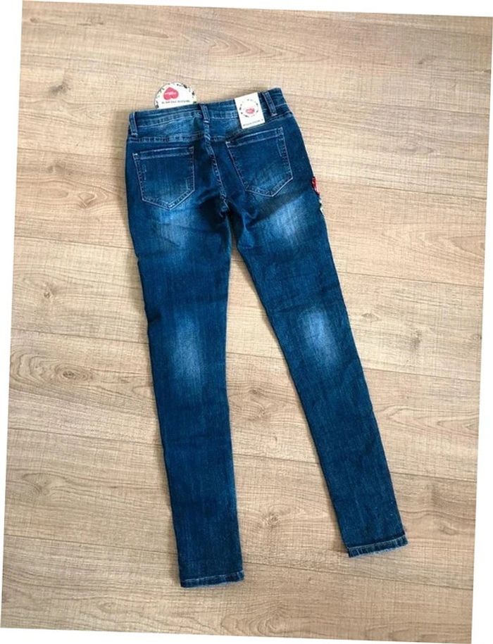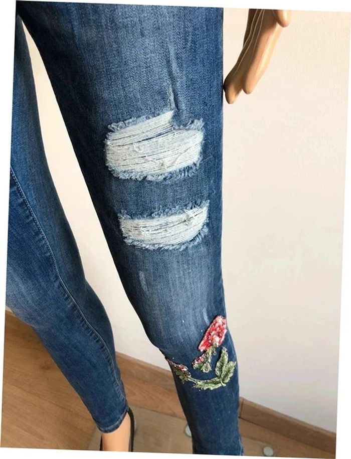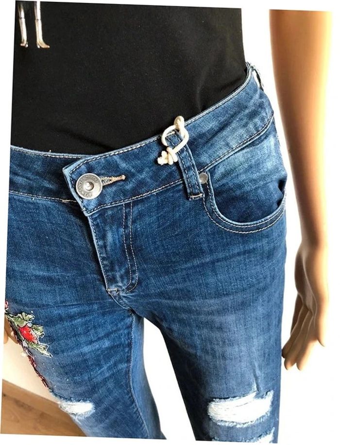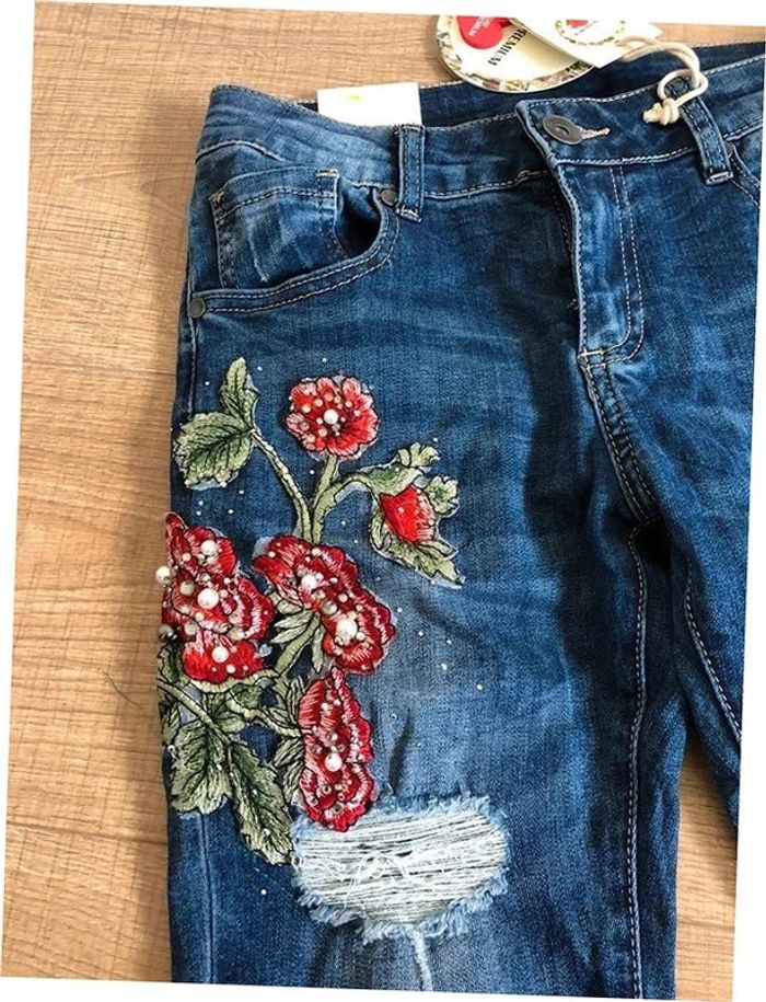 Joli jean skinny bleu foncé avec broderies et strass.