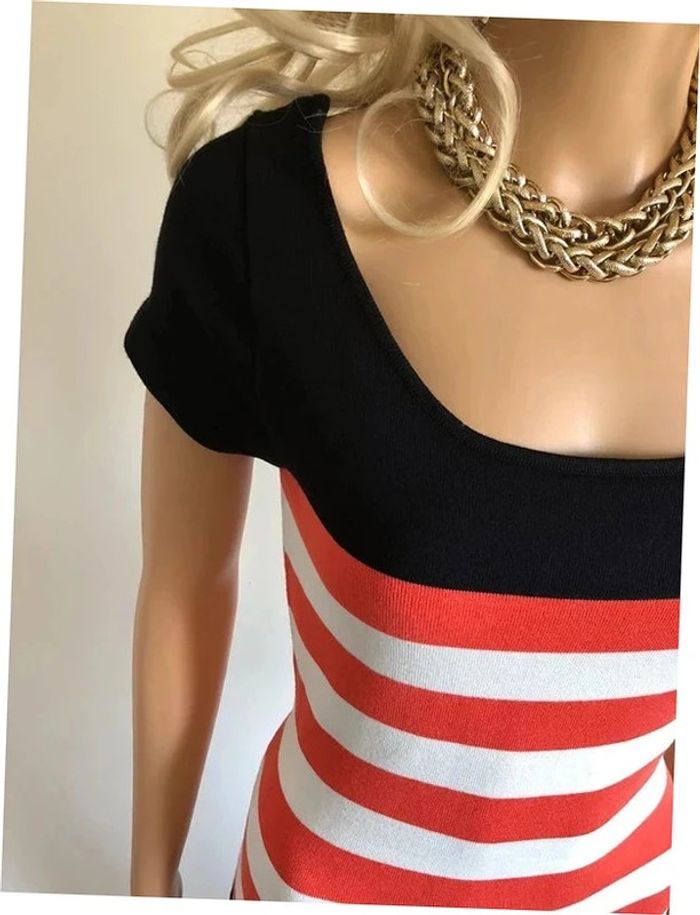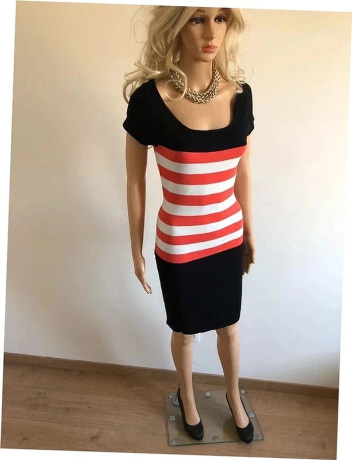 Robe tricot noire avec rayures blanches et oranges, de marque Morgan. Taille L. Elle est neuve avec étiquette. aisselle à aisselle 38 cms et plus taille 38 cms et plus longueur depuis épaule 91 cms Le tissu est extensible 88% viscose et 12% polyamide Le prix reste négociable dans la limite du raisonnable. Un petit cadeau dans le colis.