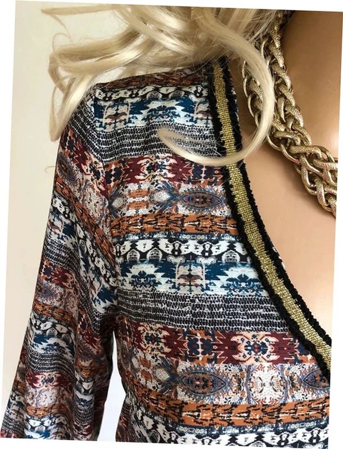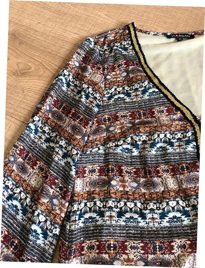 Jolie robe casual imprimée multicolore, à manches longues, de marque Morgan. Taille 38. Portée quelques fois, en très bon état. aisselle à aisselle 46 cms épaule à épaule 37 cms longueur manches 57 cms taille 45 cms longueur depuis épaule 91 cms Étiquette intérieure de composition coupée Le prix reste négociable dans la limite du raisonnable. Un petit cadeau dans le colis.
