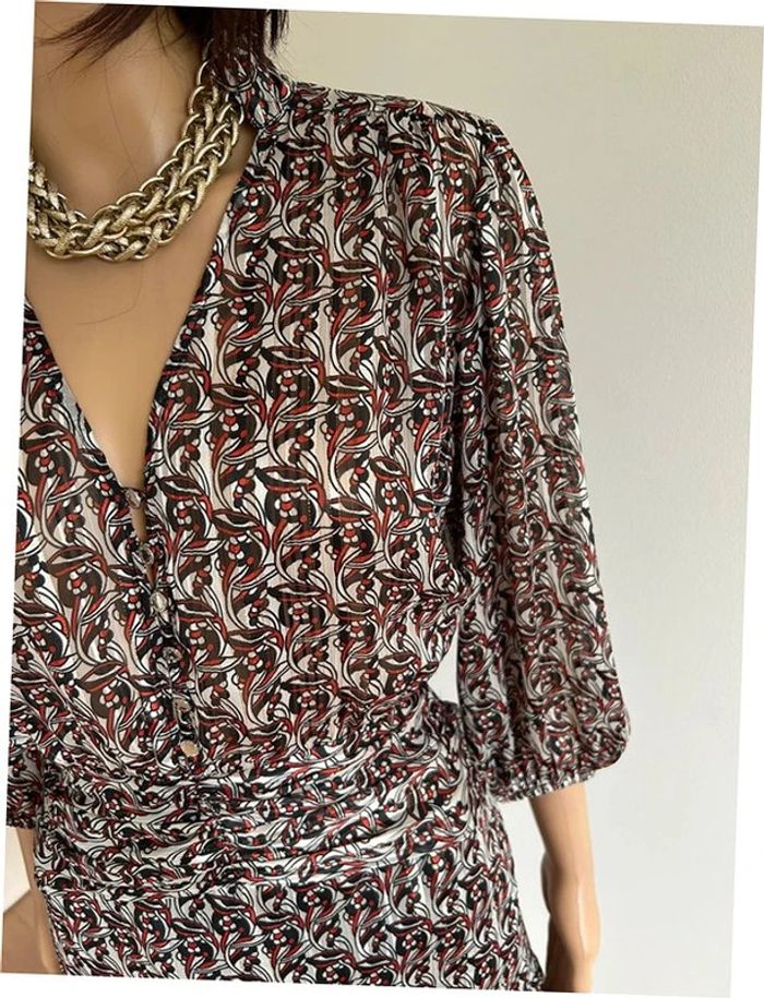 Magnifique robe imprimée à manches 3/4, avec liserés dorés, de marque Morgan. Fermeture dans le dos. Taille 40. Elle est neuve avec étiquette. aisselle à aisselle 50 cms épaule à épaule 38 cms longueur manches 43 cms taille 40 cms longueur depuis épaule 94 cms 98% polyester et 2% fil métallisé Le prix reste négociable dans la limite du raisonnable. Un petit cadeau dans le colis 🌸 (Boîte 48)