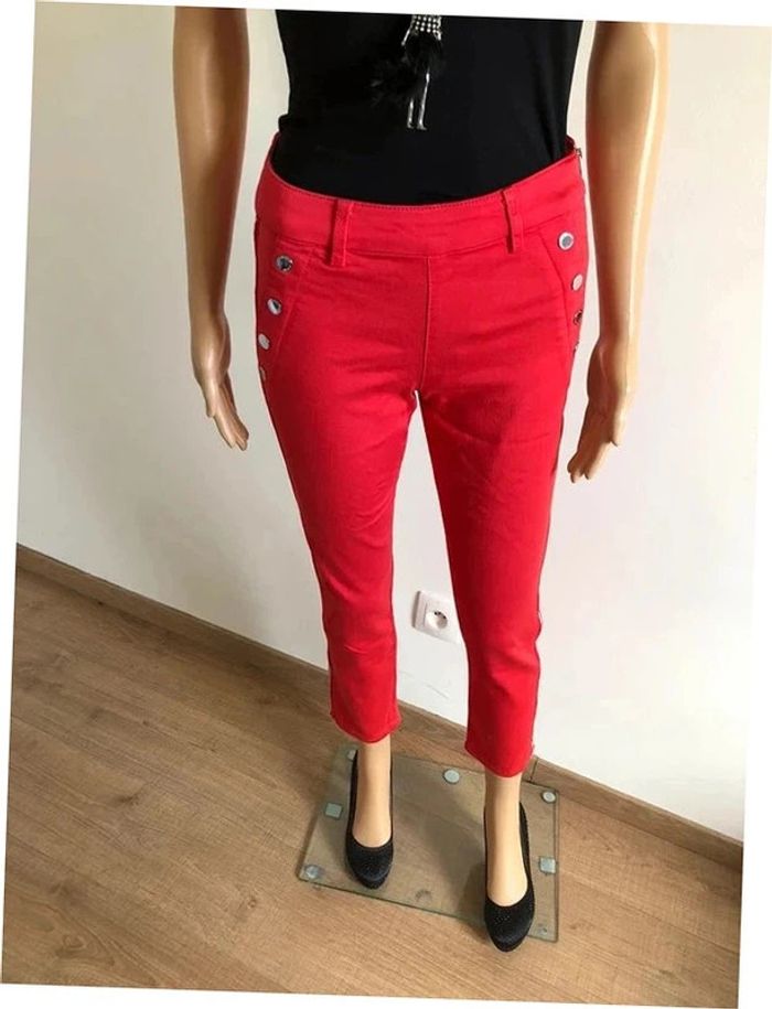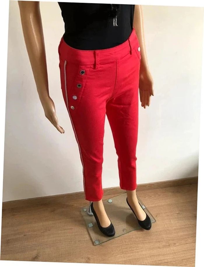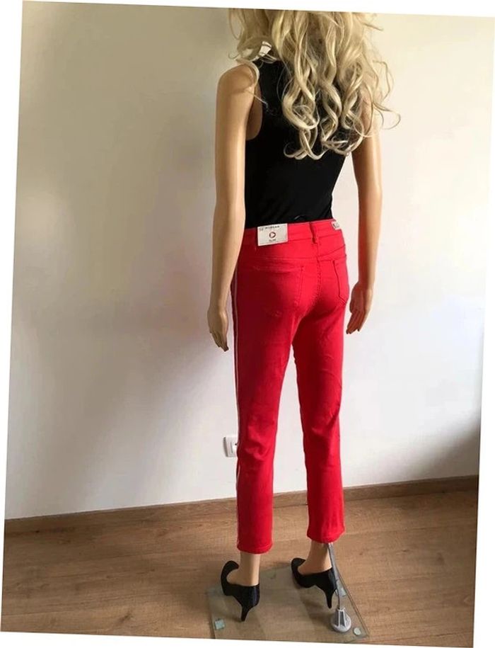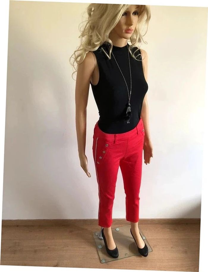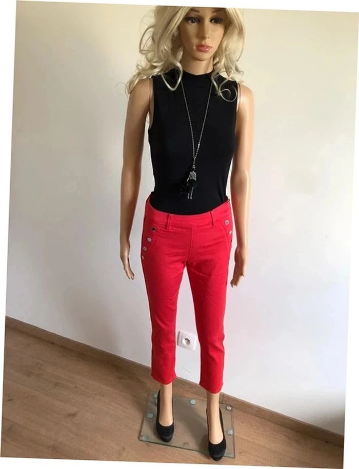 Très beau pantalon slim rouge 7/8eme de marque Morgan. Taille 34. Fermeture sur le côté, été boutons sur le devant. Bandes argentés sur les côtés. Il est neuf avec étiquette (valeur 55€). taille 33 cms et plus longueur 90 cms longueur entrejambes 67 cms Le tissu est extensible 44% viscose, 28% coton, 25% polyester et 3% elasthanne Le prix reste négociable dans la limite du raisonnable. Un petit cadeau dans le colis.