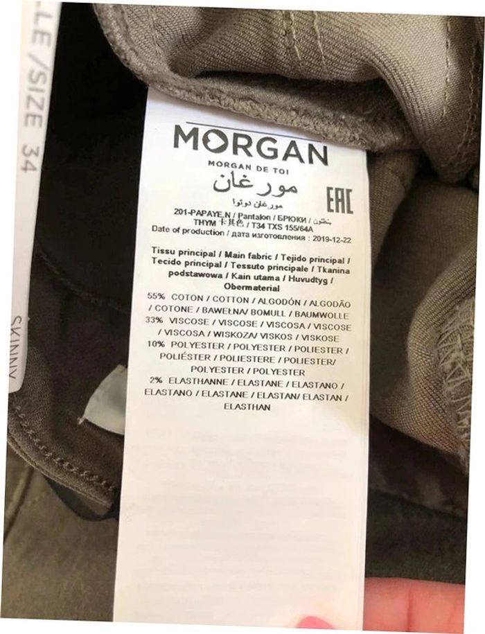 Magnifique pantalon skinny 7/8ème vert kaki et doré, de marque Morgan. Taille 34. Il est neuf avec étiquette (valeur 65€). taille 34 cms longueur 94 cms longueur entrejambes 72 cms Le tissu est extensible 55% coton, 33% viscose, 10% polyester et 2% elasthanne Le prix reste négociable dans la limite du raisonnable. Un petit cadeau dans le colis.