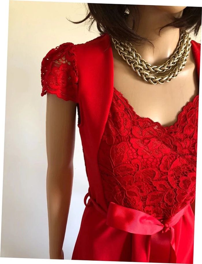 Magnifique robe rouge avec dentelle, à manches courtes, de marque Morgan. Ruban à nouer autour de la taille. Taille 36. Jamais portée, état neuf. aisselle à aisselle 42 cms et plus épaule à épaule 35 cms et plus taille 36 cms et plus longueur depuis épaule 89 cms Le tissu est extensible 95% polyester et 5% elasthanne Le prix reste négociable dans la limite du raisonnable. Un petit cadeau dans le colis.