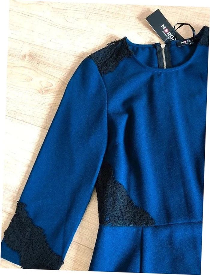 Magnifique robe bleue marine et noire, avec dentelle,de marque Morgan. Fermeture dans le dos. Taille 36. Elle est neuve avec étiquette (valeur 69€). aisselle à aisselle 42 cms épaule à épaule 37 cms taille 35 cms longueur depuis épaule 91 cms 97% polyester et 3% elasthanne Le prix reste négociable dans la limite du raisonnable. Un petit cadeau dans le colis.