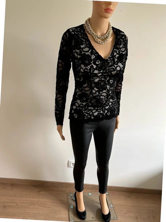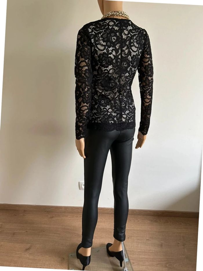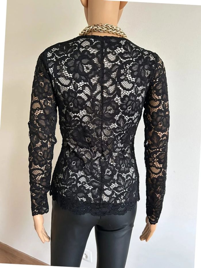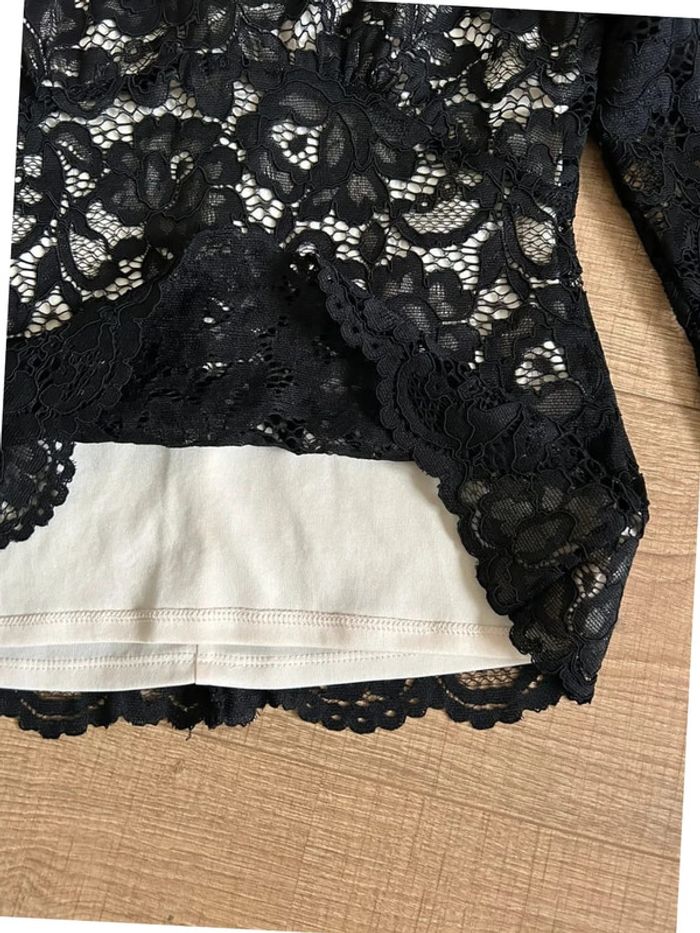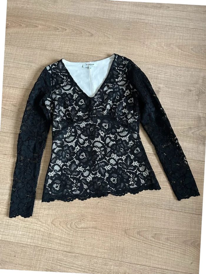 Magnifique haut noir en dentelle à manches longues, avec doublure beige, de marque Morgan. Taille XS. Jamais porté, état neuf. aisselle à aisselle 41 cms et plus épaule à épaule 36 cms et plus longueur manches 59 cms taille 35 cms et plus longueur depuis épaule 58 cms Le tissu est extensible Étiquette intérieure de composition coupée Le prix reste négociable dans la limite du raisonnable. Un petit cadeau dans le colis 🌸 (Boîte 4)