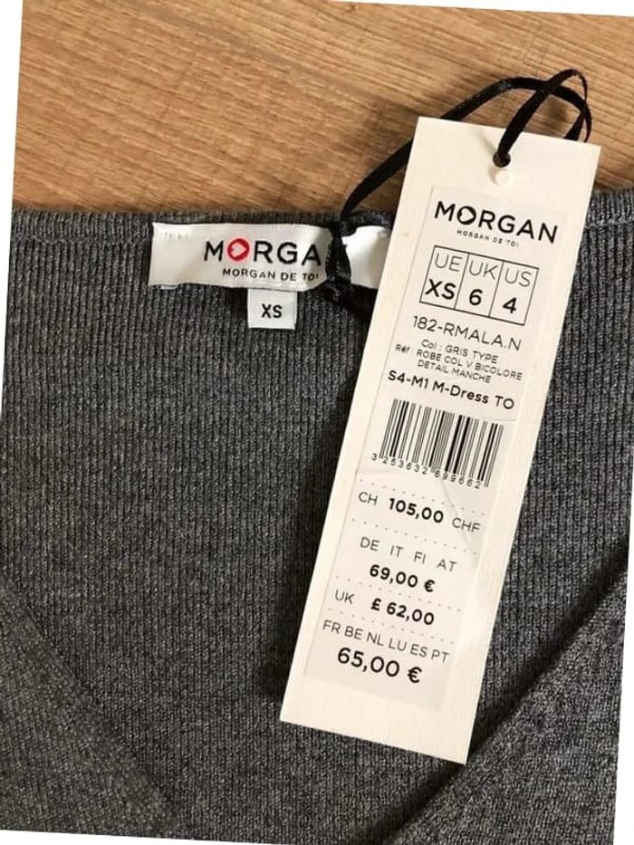 Magnifique robe pull grise, à manches longues, de marque Morgan. Taille XS. Elle est neuve avec étiquette (valeur 65€). aisselle à aisselle 39 cms et plus épaule à épaule 36 cms et plus longueur manches 55 cms taille 38 cms et plus longueur depuis épaule 83 cms Le tissu est extensible 54% viscose, 26% polyester et 20% polyamide Le prix reste négociable dans la limite du raisonnable. Un petit cadeau dans le colis.