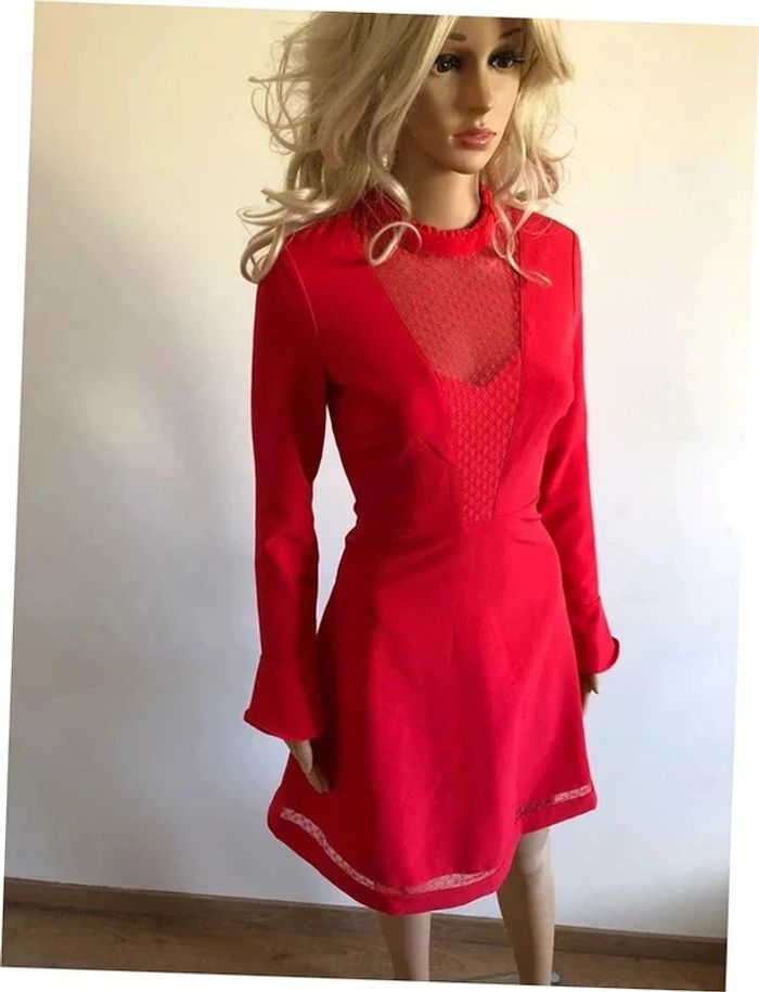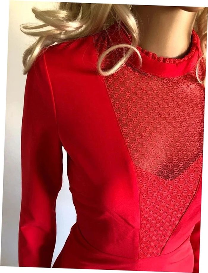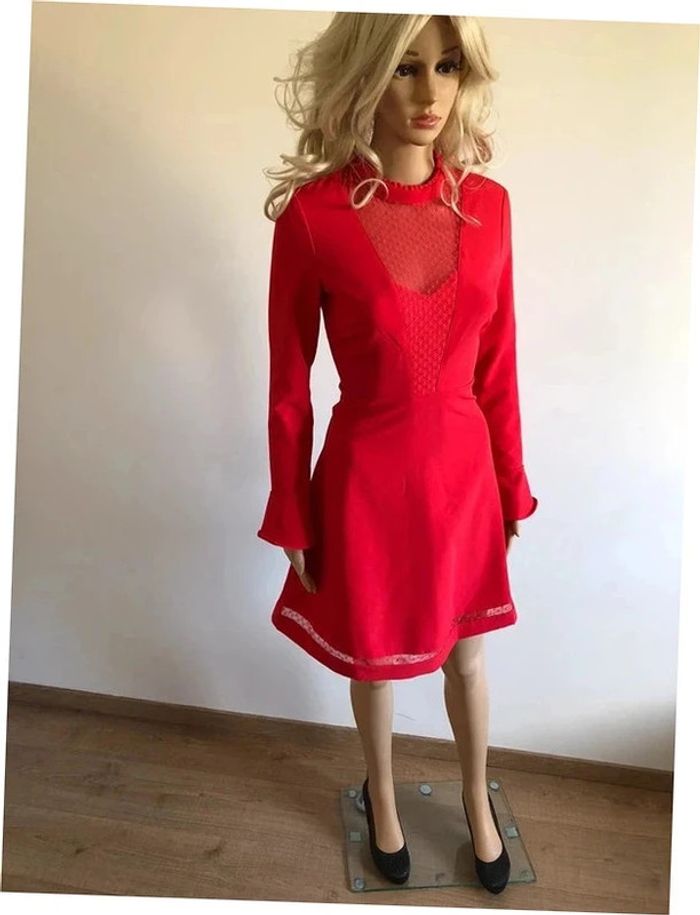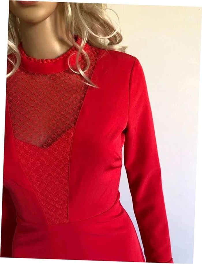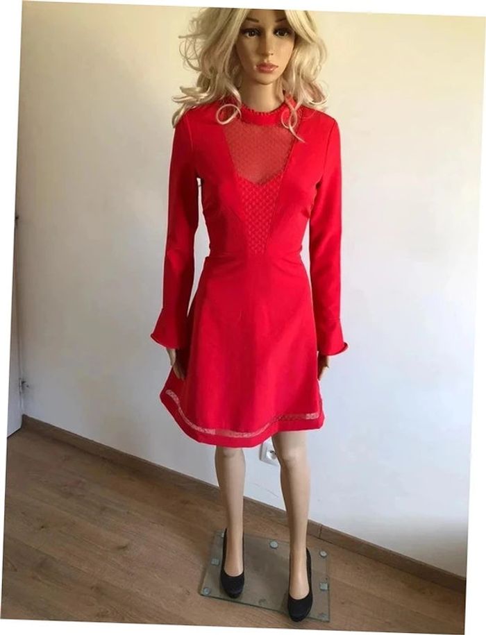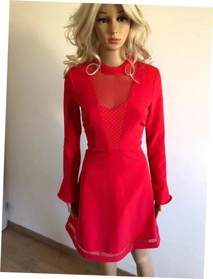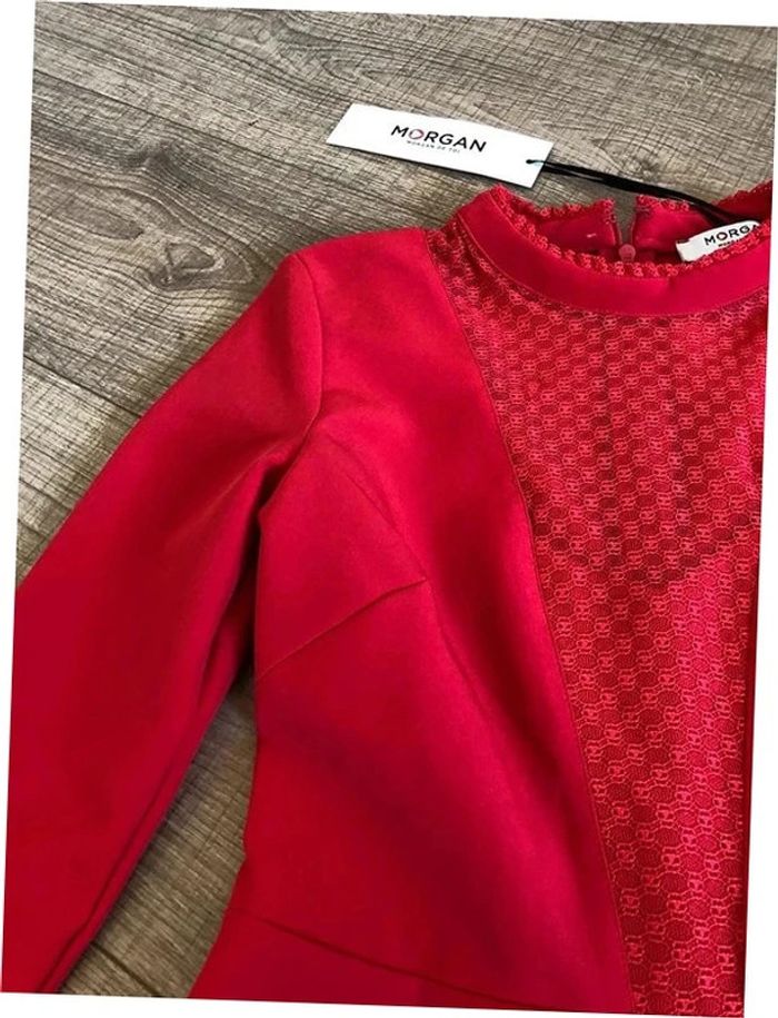 Magnifique robe rouge corail, à manches longues, avec empiècement dentelle transparente au niveau du décolleté, de marque Morgan. Taille 34. Elle est neuve avec étiquette. aisselle à aisselle 41 cms épaule à épaule 37 cms longueur manches 60 cms taille 34 cms longueur depuis épaule 88 cms 95% polyester et 5% elasthanne Le prix reste négociable dans la limite du raisonnable. Un petit cadeau dans le colis.