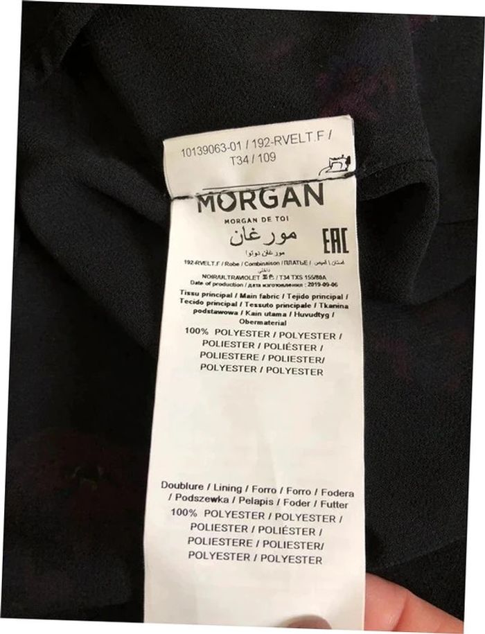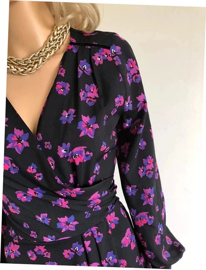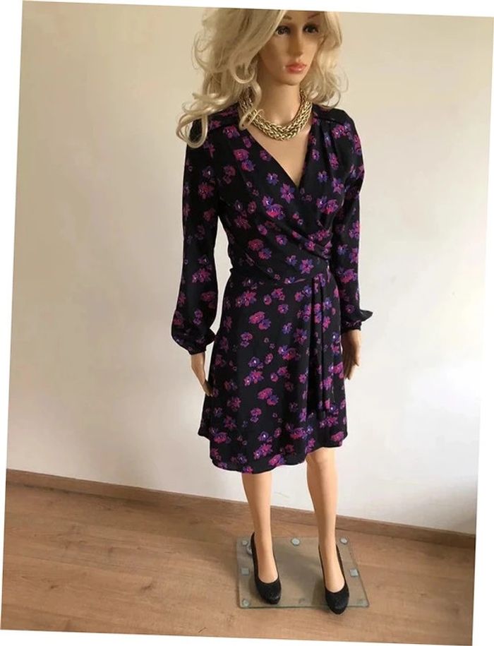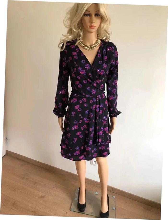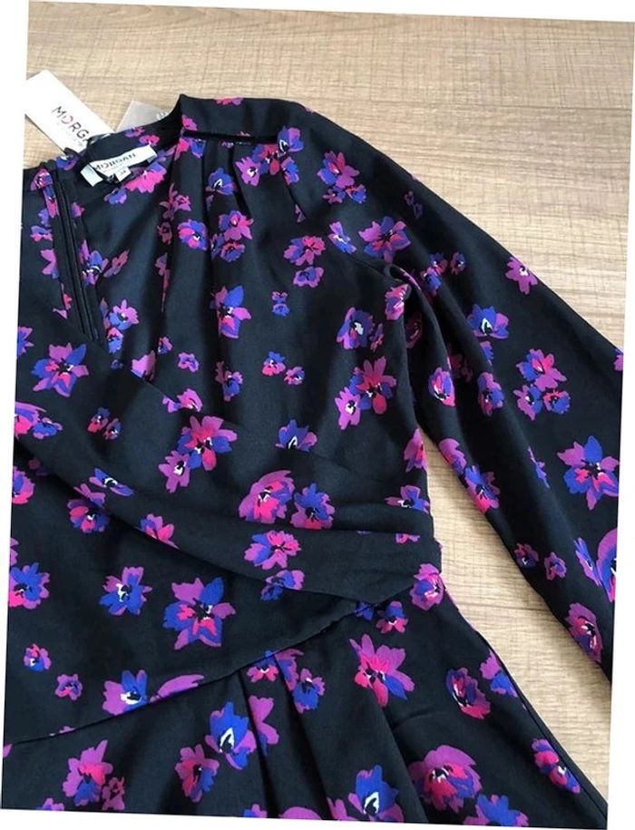 Magnifique robe imprimée fleurie noire et violette, à manches longues, de marque Morgan. Taille 34. Fermeture dans le dos. Elle est neuve avec étiquette (valeur 75€). aisselle à aisselle 44 cms épaule à épaule 38 cms longueur manches 60 cms taille 34 cms longueur depuis épaule 92 cms 100% polyester Le prix reste négociable dans la limite du raisonnable. Un petit cadeau dans le colis.
