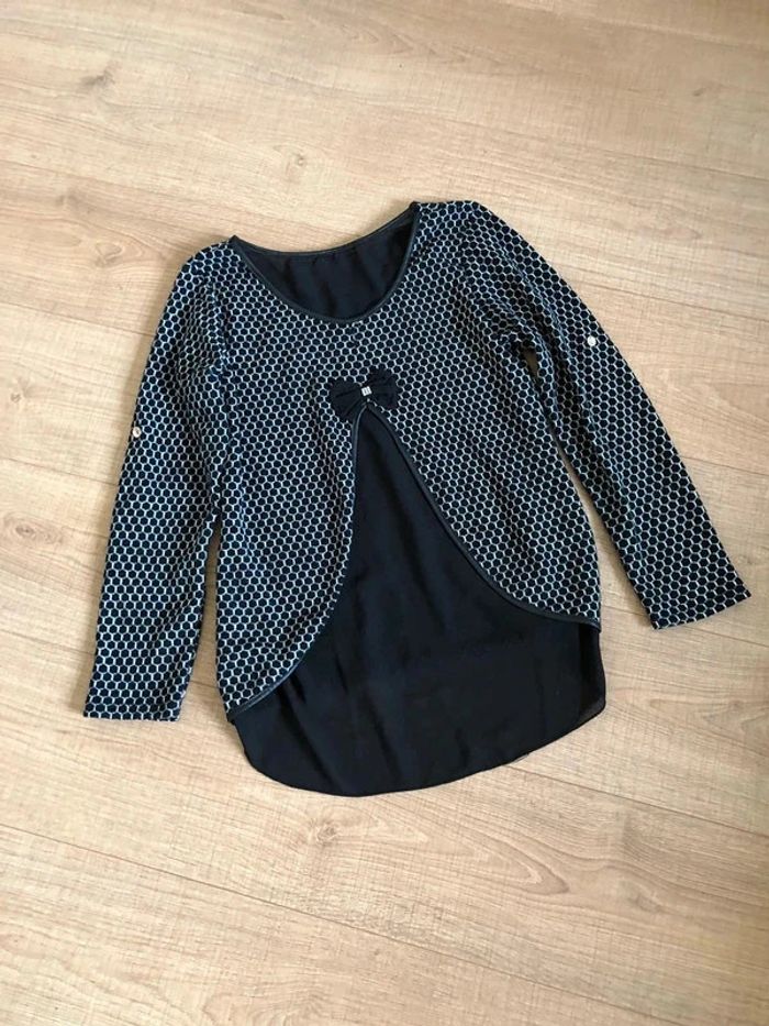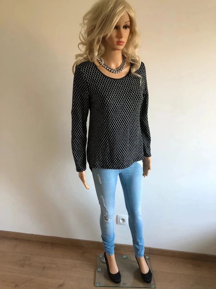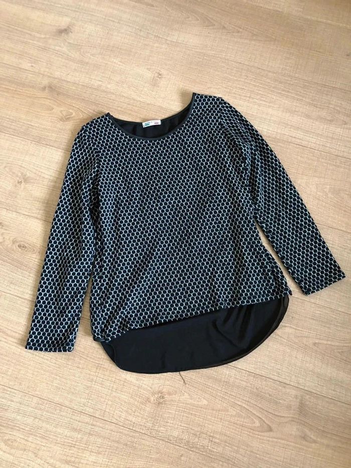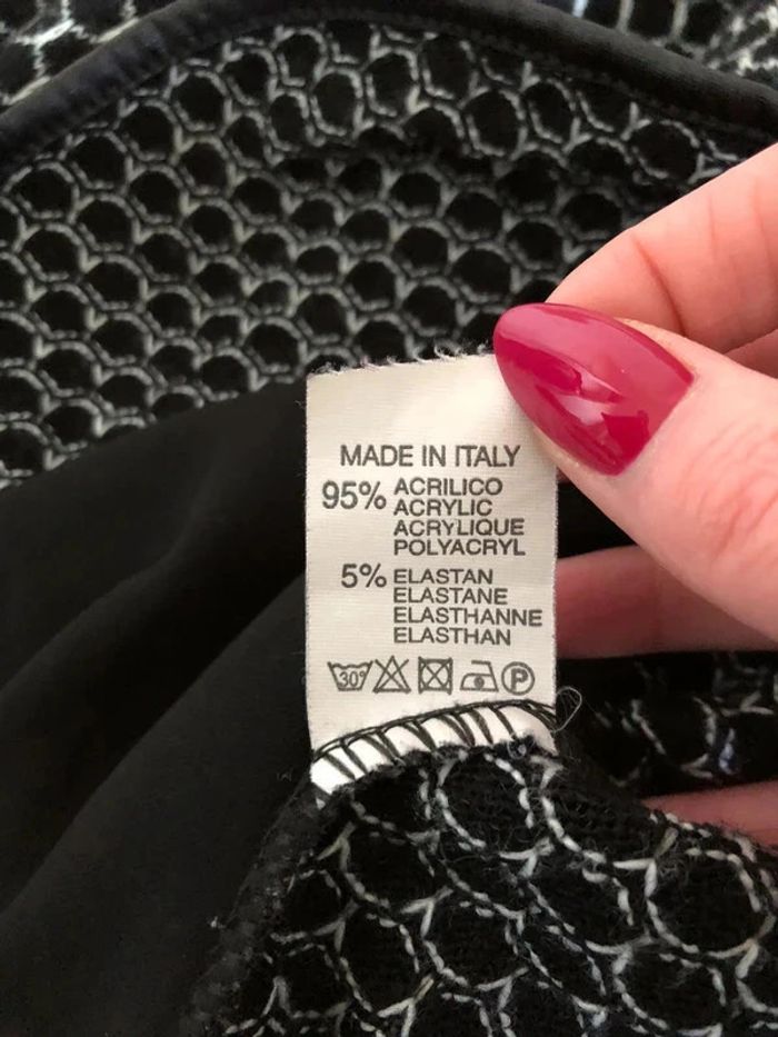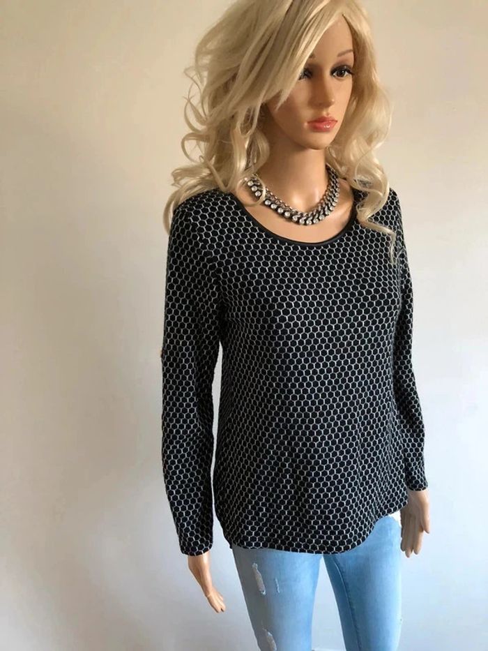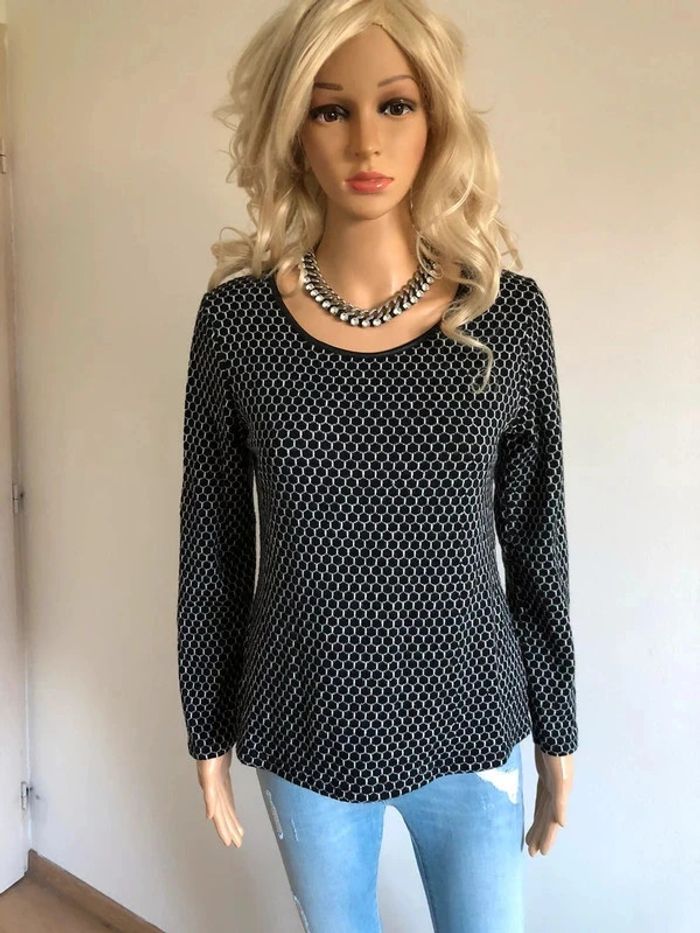 Joli pull noir et blanc à manches longues, de marque Made in Italy. Peut se porter manches longues ou manches remontées. Taille unique qui convient pour du 34/36. Porté quelques fois mais encore en bon état. aisselle à aisselle 45 cms épaule à épaule 37 cms longueur manches 55 cms taille 41 cms longueur depuis épaule 56 cms 95% acrylique et 5% elasthanne Le prix reste négociable dans la limite du raisonnable.